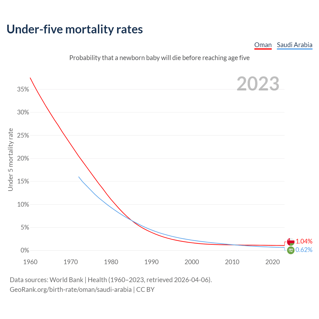 The chance that a newborn baby will die before reaching age five is 1.04% in Oman and 0.62% in Saudi Arabia. Above is a chart with historical data on under-five mortality rates.
