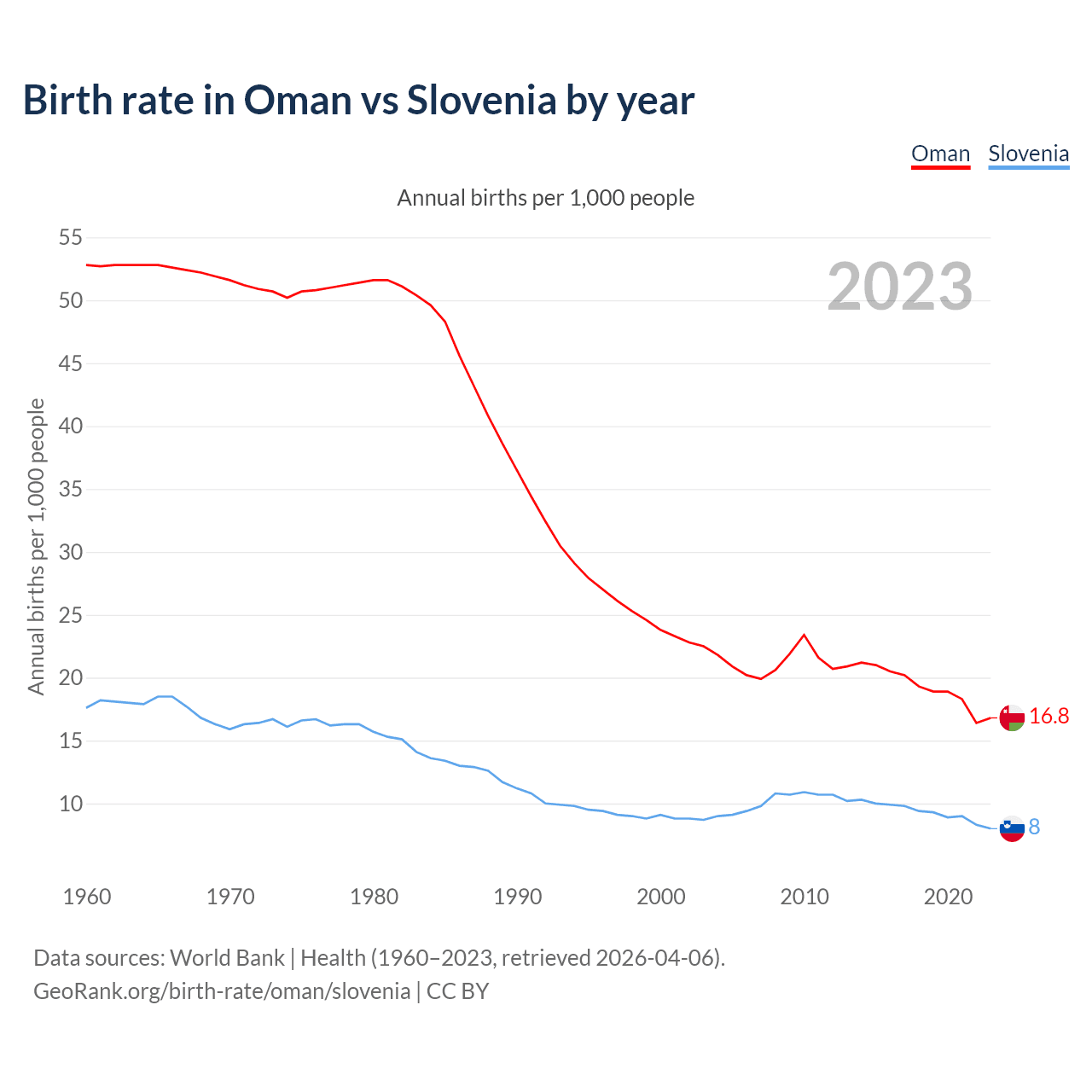 According to the latest available data on birth rates, the fertility rate in Oman was 2.53 children per woman in 2023, compared to 1.51 in Slovenia in 2023. The replacement level is considered to be 2.1 children per woman.