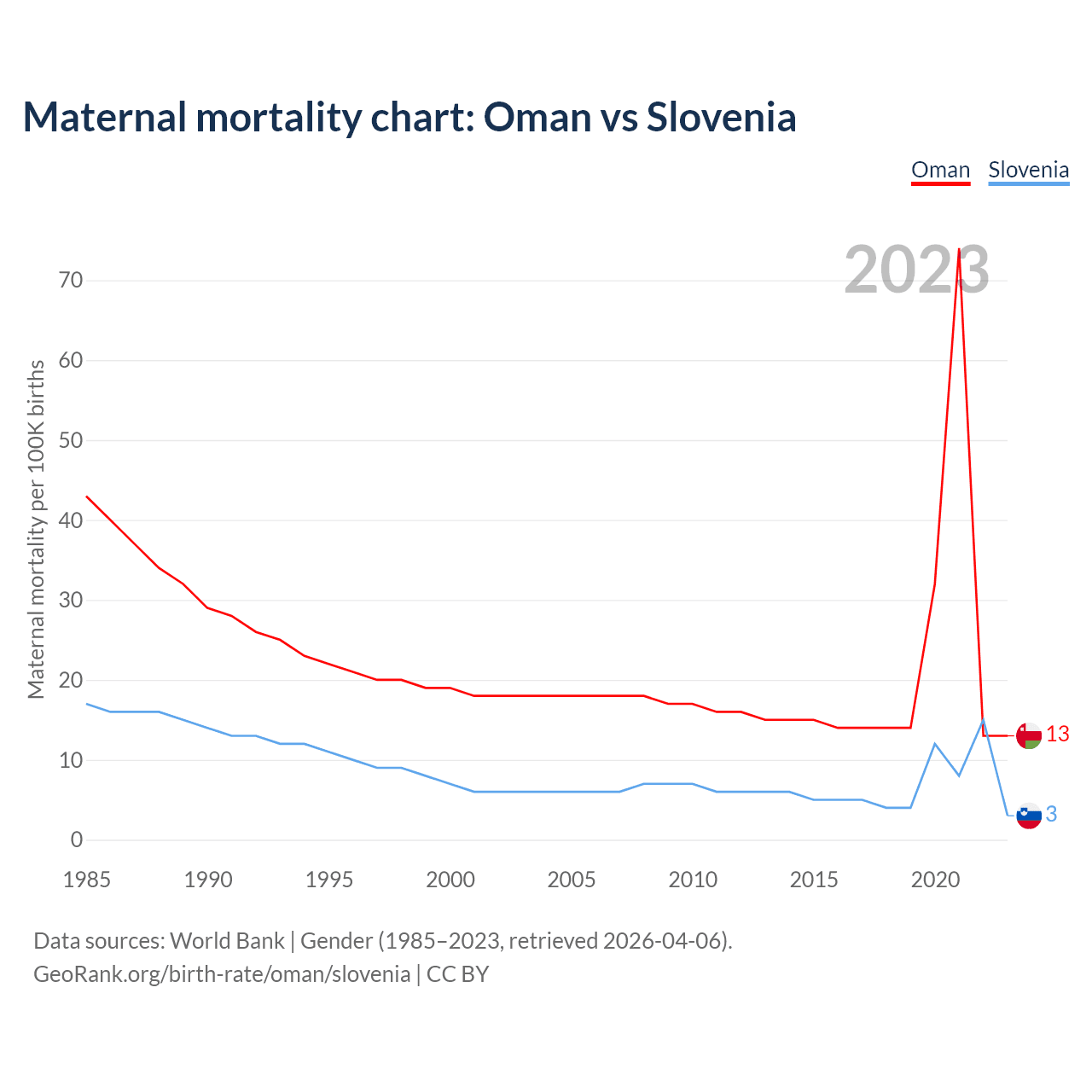 The maternal mortality rate, which is the probability of dying during childbirth or within 42 days of pregnancy termination, is 13 deaths per 100,000 live births in Oman, compared to 3 deaths in Slovenia.