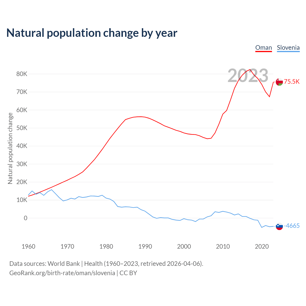 Oman has an annual birth rate of 16.8 births per 1,000 people, compared to 8 for Slovenia. The average number of children a woman is expected to have during her lifetime — the fertility rate, is 2.53 in Oman and 1.51 in Slovenia — 40.2% difference.