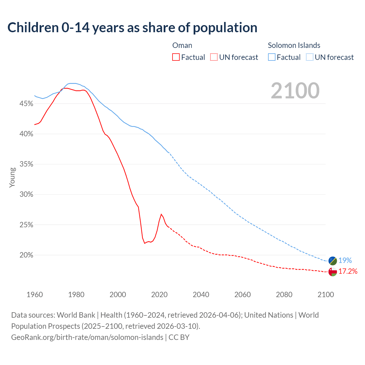 Oman has an annual birth rate of 16.8 births per 1,000 people, compared to 26.9 for the Solomon Islands. The average number of children a woman is expected to have during her lifetime — the fertility rate, is 2.53 in Oman and 3.56 in the Solomon Islands — 40.9% difference.