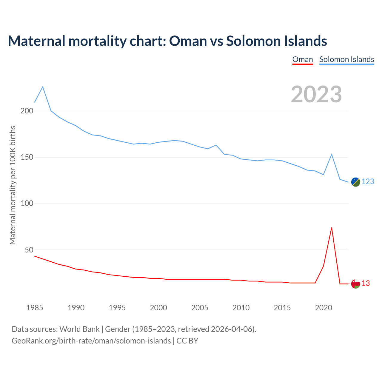 The maternal mortality rate, which is the probability of dying during childbirth or within 42 days of pregnancy termination, is 13 deaths per 100,000 live births in Oman, compared to 123 deaths in the Solomon Islands.