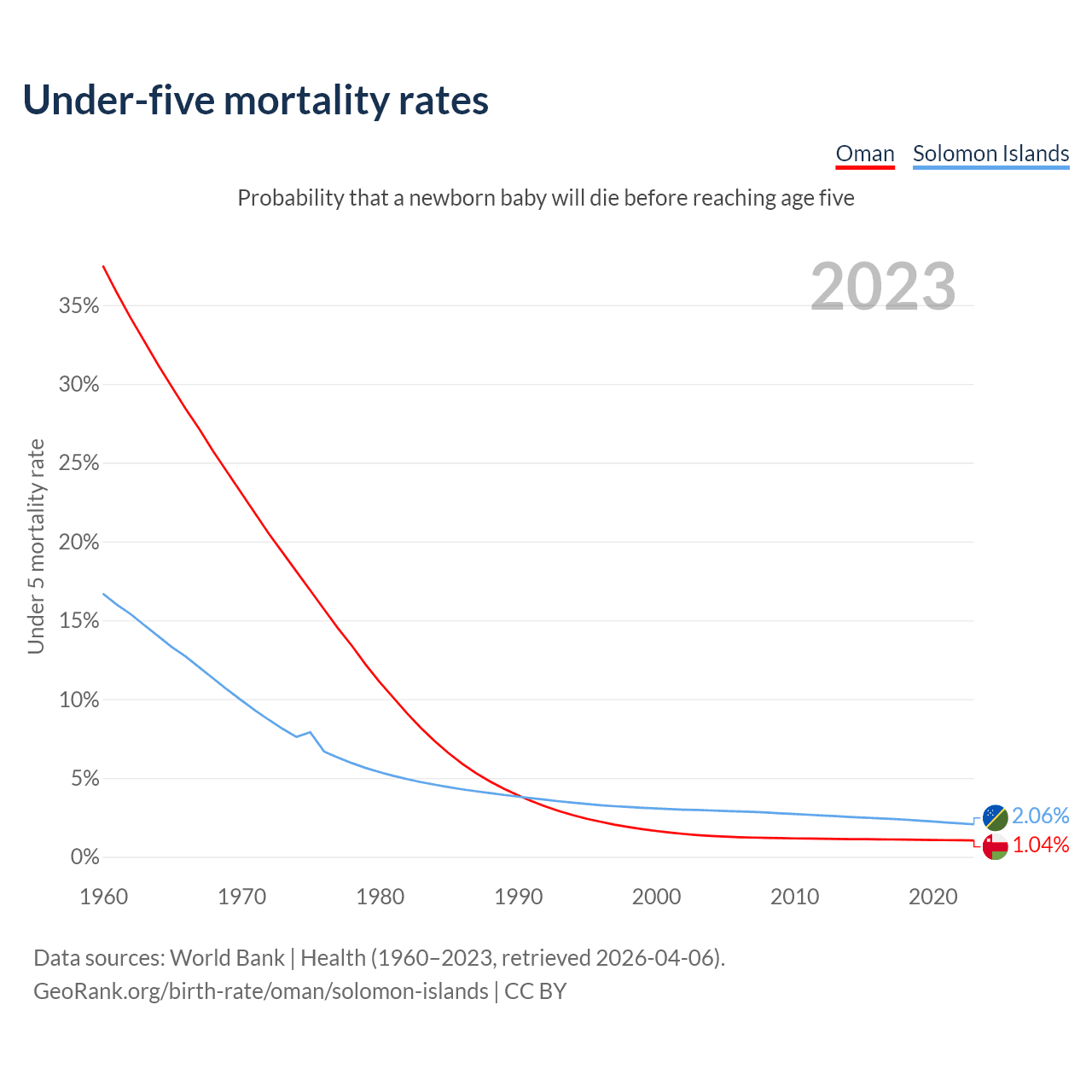 The chance that a newborn baby will die before reaching age five is 1.04% in Oman and 2.06% in the Solomon Islands. Above is a chart with historical data on under-five mortality rates.