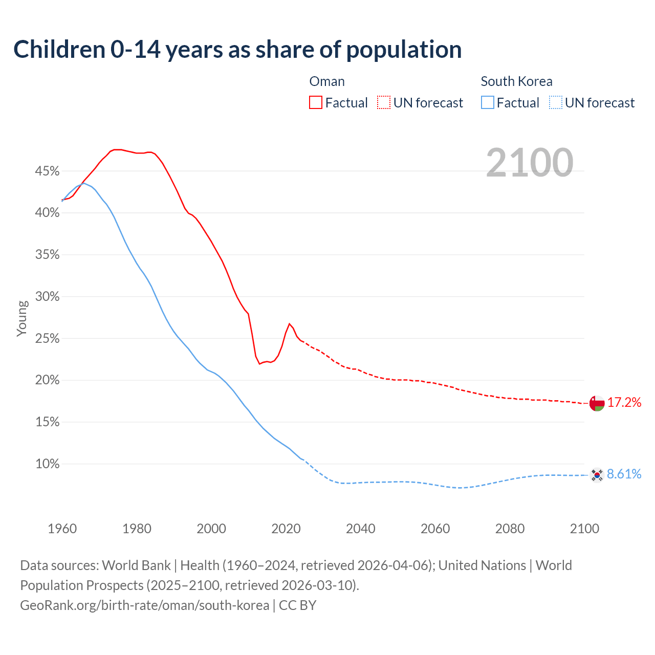 Oman has an annual birth rate of 16.8 births per 1,000 people, compared to 4.5 for South Korea. The average number of children a woman is expected to have during her lifetime — the fertility rate, is 2.53 in Oman and 0.72 in South Korea — 71.4% difference.