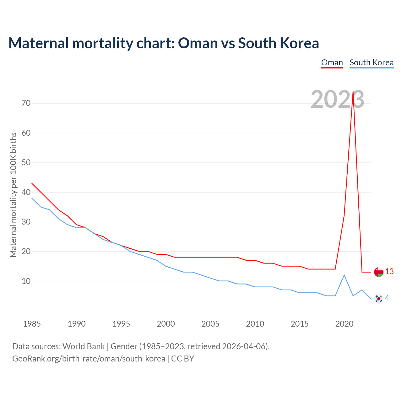 The maternal mortality rate, which is the probability of dying during childbirth or within 42 days of pregnancy termination, is 13 deaths per 100,000 live births in Oman, compared to 4 deaths in South Korea.