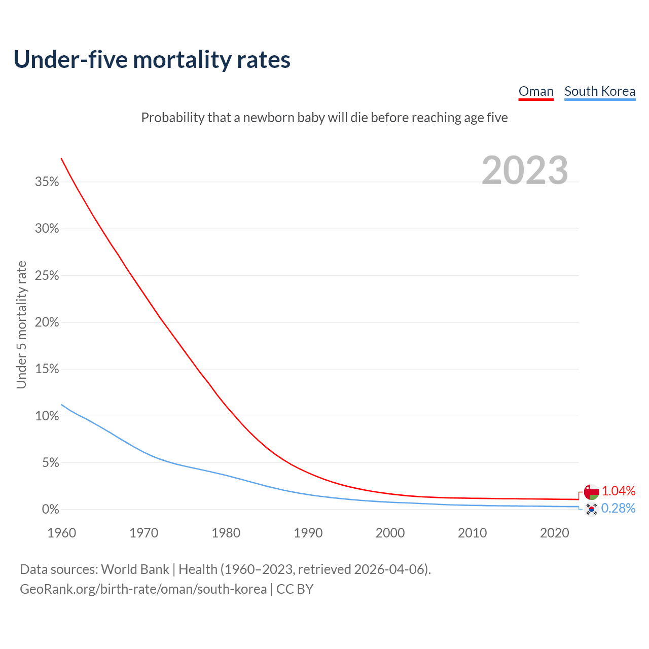 The chance that a newborn baby will die before reaching age five is 1.04% in Oman and 0.28% in South Korea. Above is a chart with historical data on under-five mortality rates.