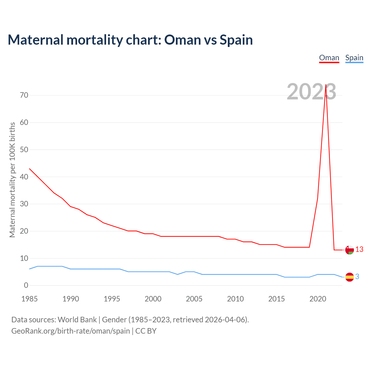 The maternal mortality rate, which is the probability of dying during childbirth or within 42 days of pregnancy termination, is 13 deaths per 100,000 live births in Oman, compared to 3 deaths in Spain.