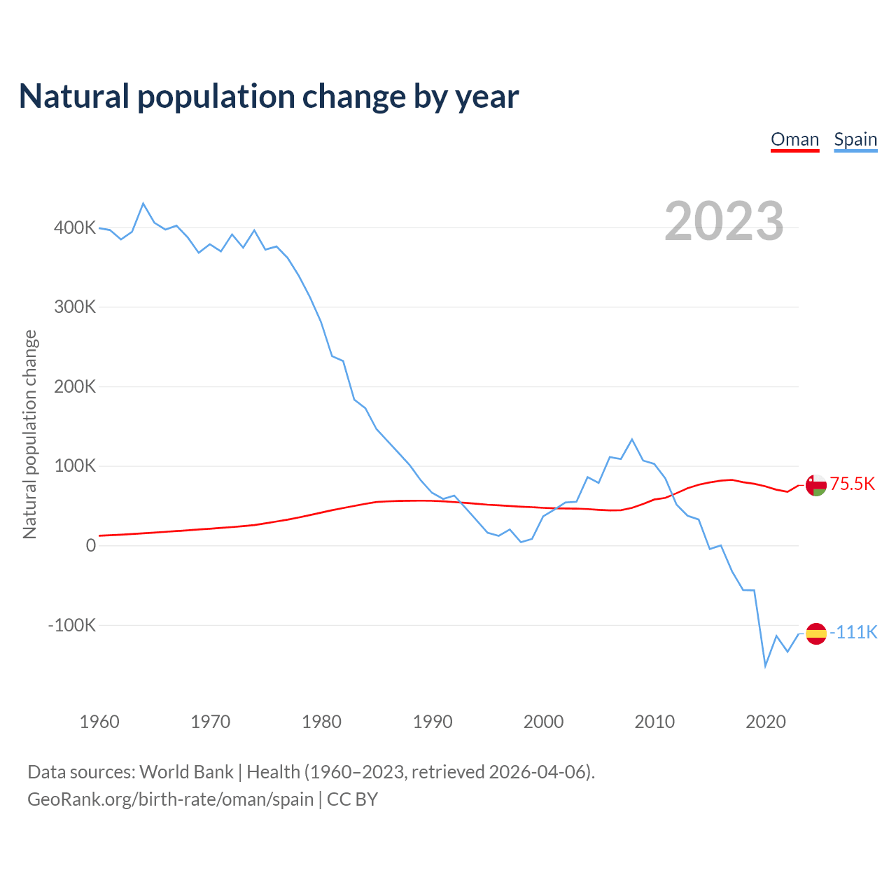 According to the latest available data on birth rates, the fertility rate in Oman was 2.53 children per woman in 2023, compared to 1.12 in Spain in 2023. The replacement level is considered to be 2.1 children per woman.