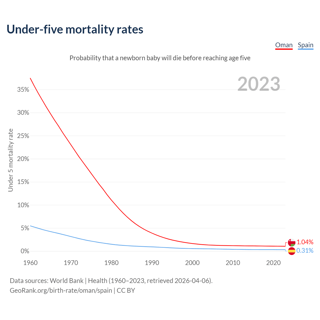The chance that a newborn baby will die before reaching age five is 1.04% in Oman and 0.31% in Spain. Above is a chart with historical data on under-five mortality rates.