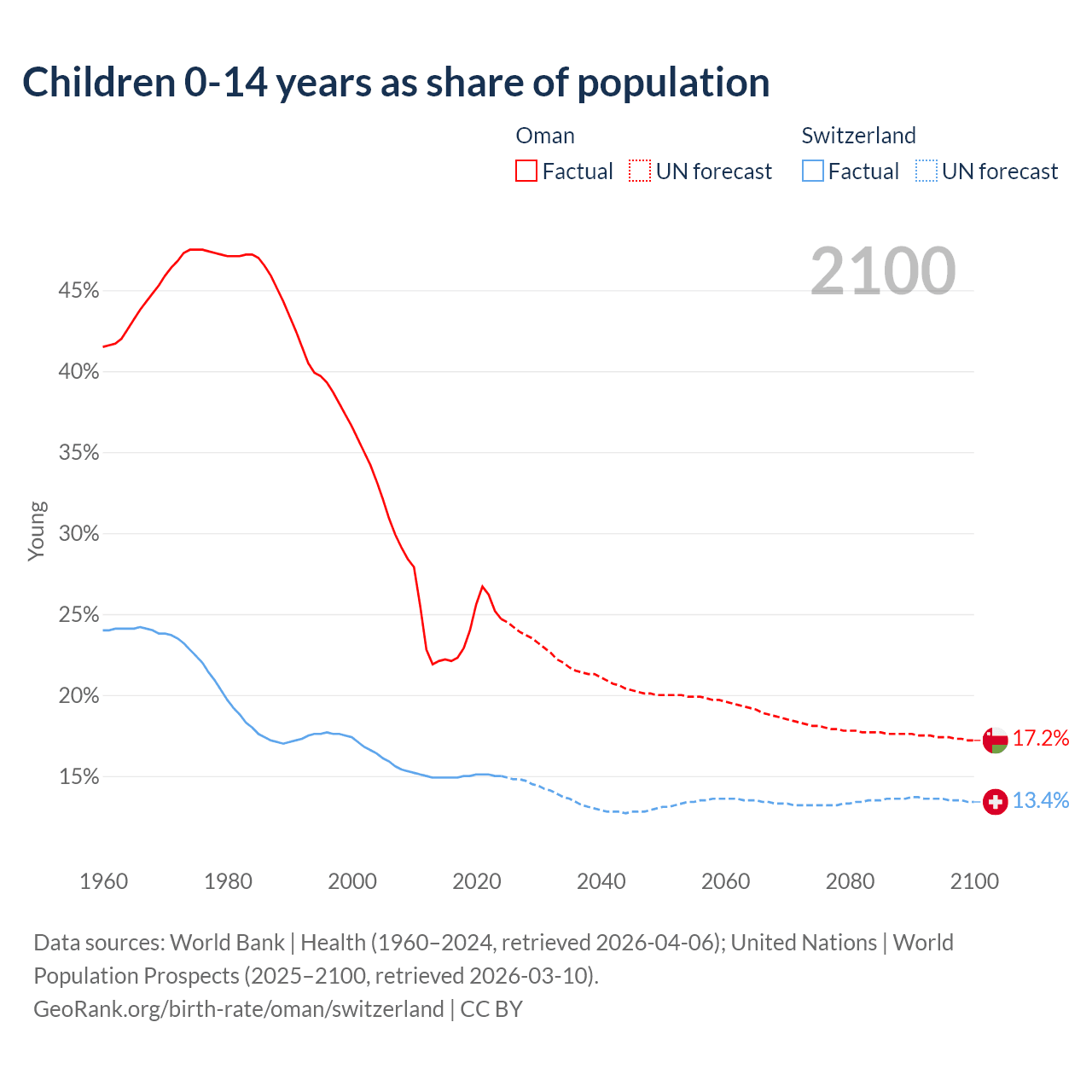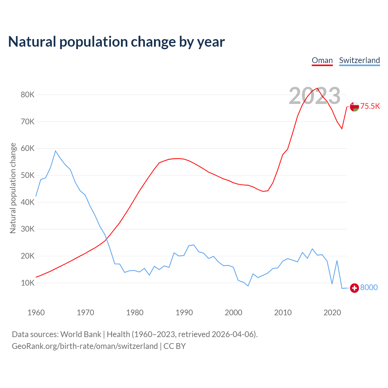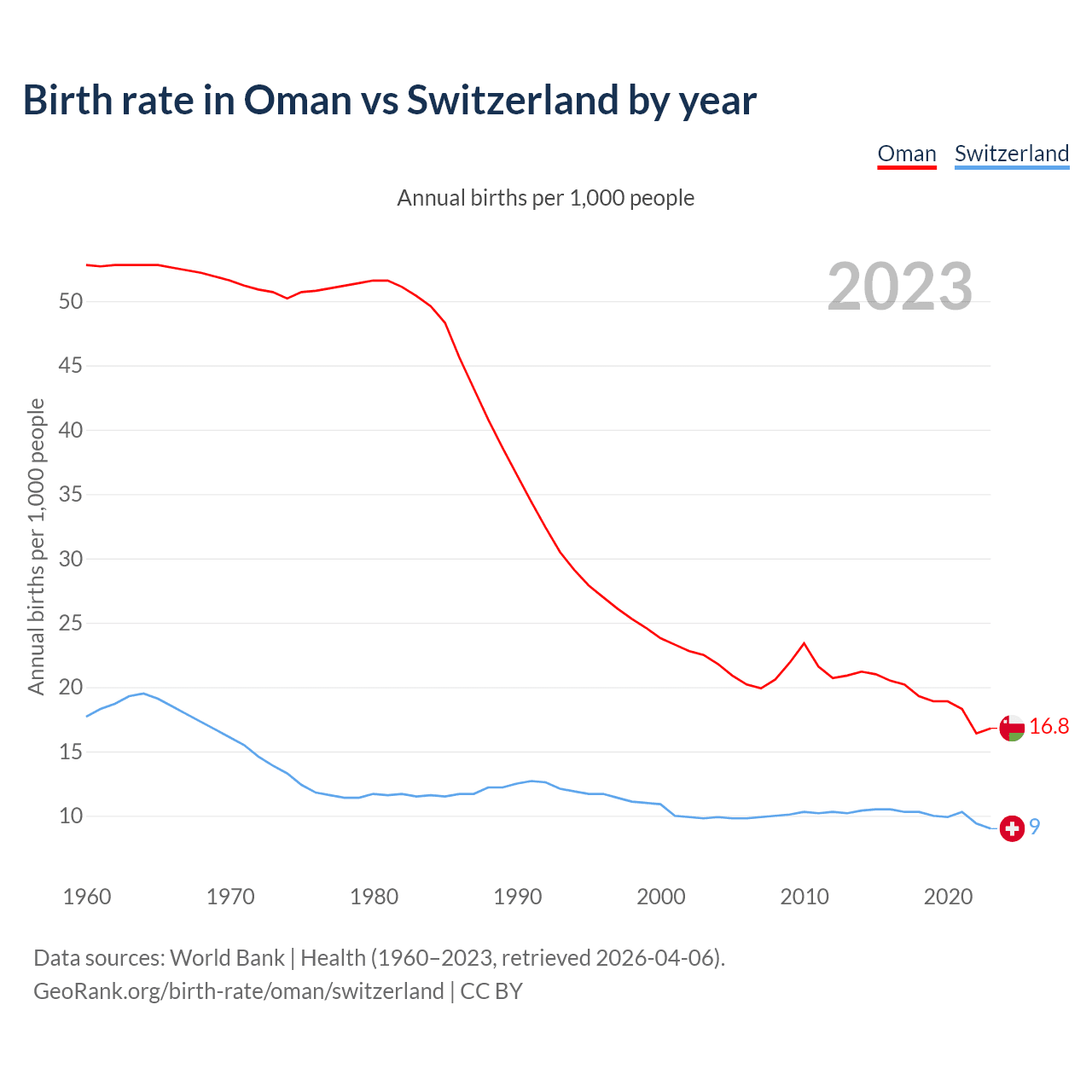 Oman has an annual birth rate of 16.8 births per 1,000 people, compared to 9 for Switzerland. The average number of children a woman is expected to have during her lifetime — the fertility rate, is 2.53 in Oman and 1.33 in Switzerland — 47.3% difference.