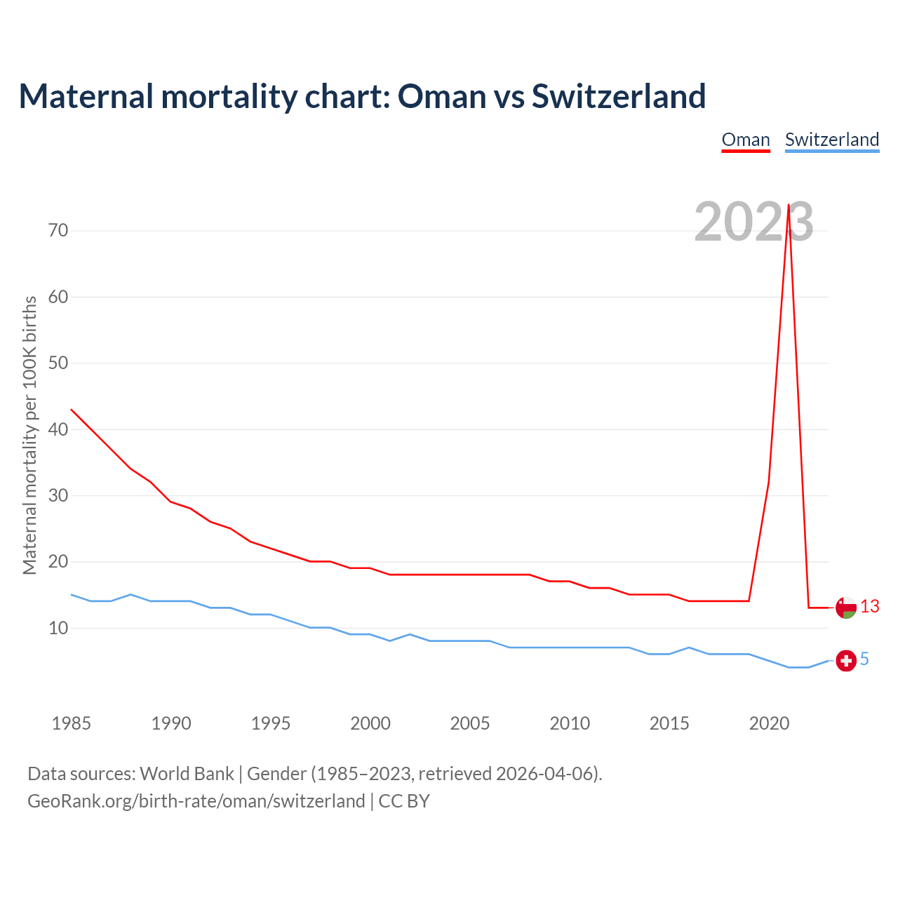 The maternal mortality rate, which is the probability of dying during childbirth or within 42 days of pregnancy termination, is 13 deaths per 100,000 live births in Oman, compared to 5 deaths in Switzerland.