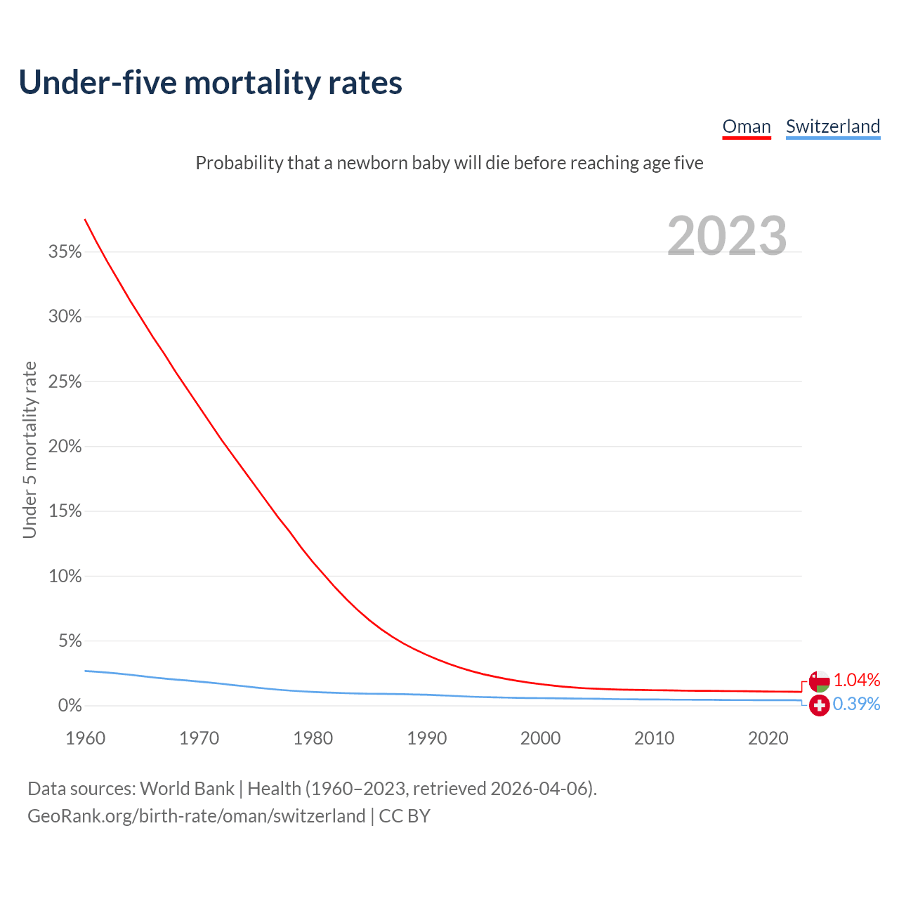 The chance that a newborn baby will die before reaching age five is 1.04% in Oman and 0.39% in Switzerland. Above is a chart with historical data on under-five mortality rates.