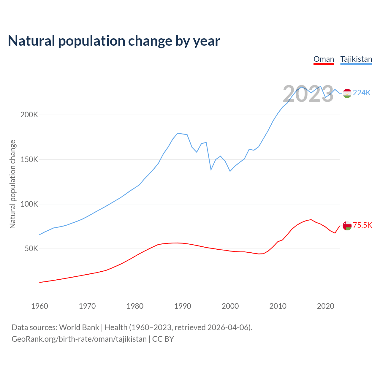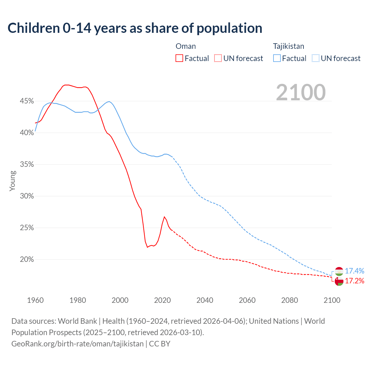 Oman has an annual birth rate of 16.8 births per 1,000 people, compared to 26.1 for Tajikistan. The average number of children a woman is expected to have during her lifetime — the fertility rate, is 2.53 in Oman and 3.07 in Tajikistan — 21.7% difference.