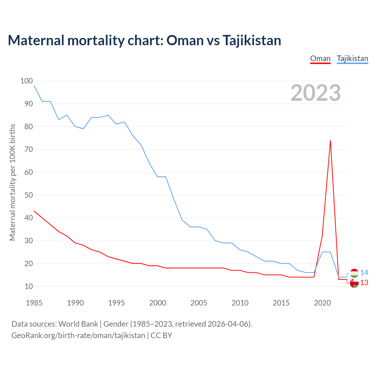 The maternal mortality rate, which is the probability of dying during childbirth or within 42 days of pregnancy termination, is 13 deaths per 100,000 live births in Oman, compared to 14 deaths in Tajikistan.