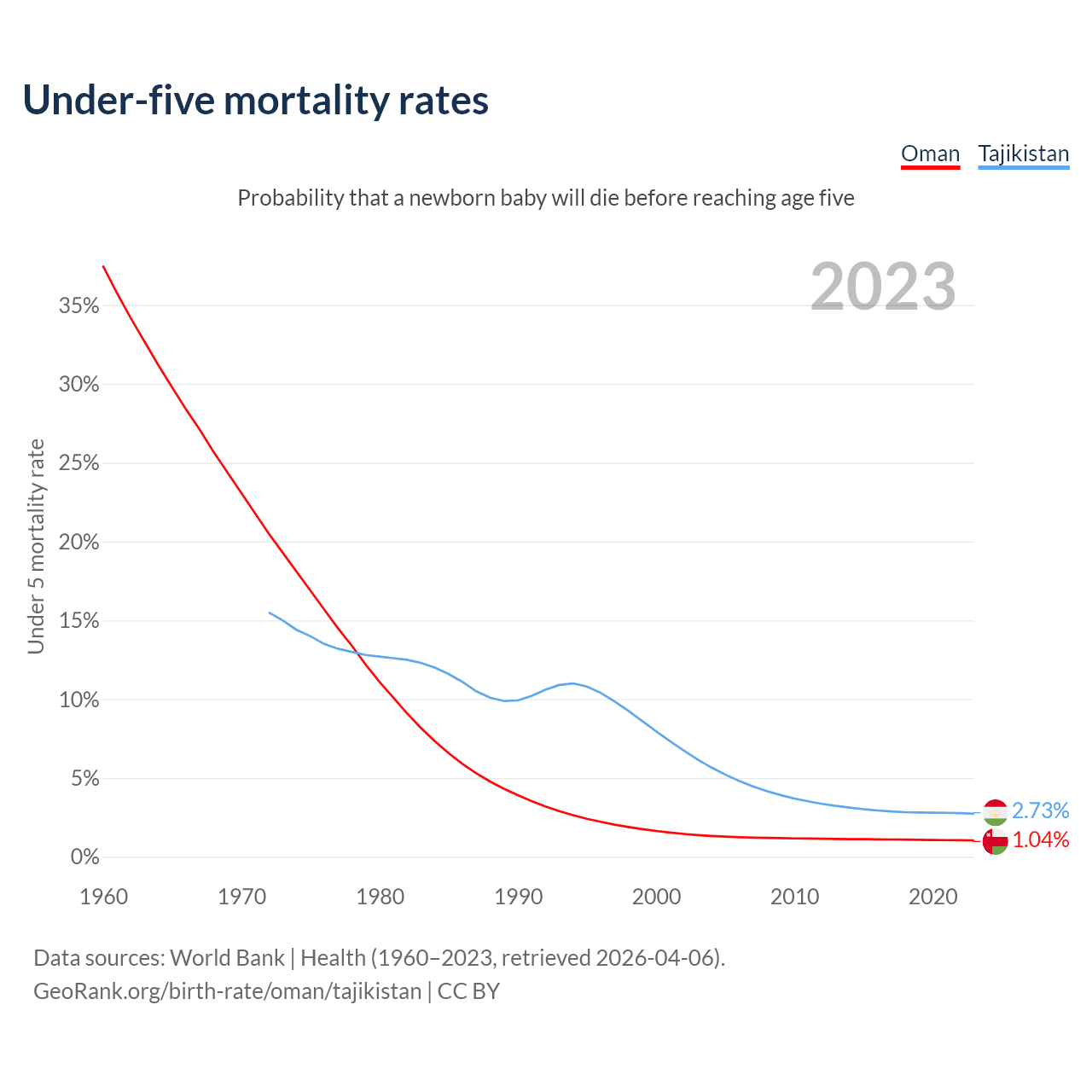 The chance that a newborn baby will die before reaching age five is 1.04% in Oman and 2.73% in Tajikistan. Above is a chart with historical data on under-five mortality rates.