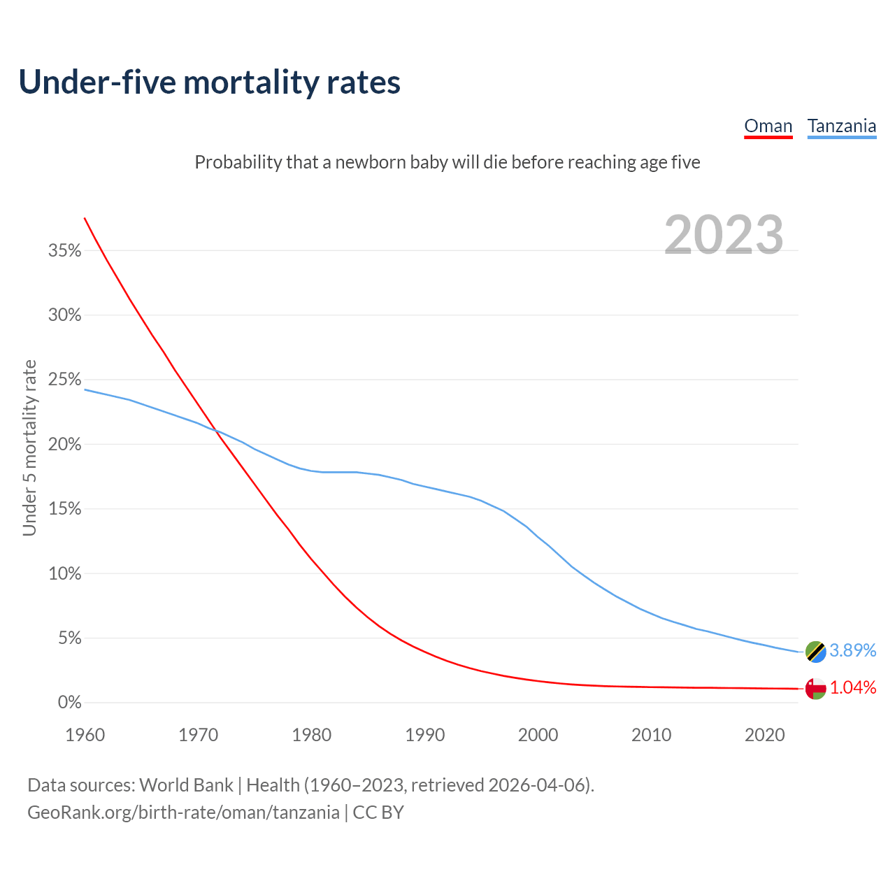 The chance that a newborn baby will die before reaching age five is 1.04% in Oman and 3.89% in Tanzania. Above is a chart with historical data on under-five mortality rates.