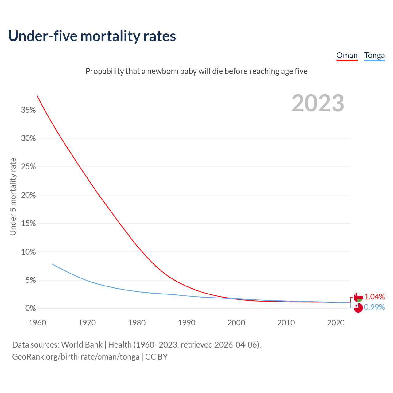 The chance that a newborn baby will die before reaching age five is 1.04% in Oman and 0.99% in Tonga. Above is a chart with historical data on under-five mortality rates.