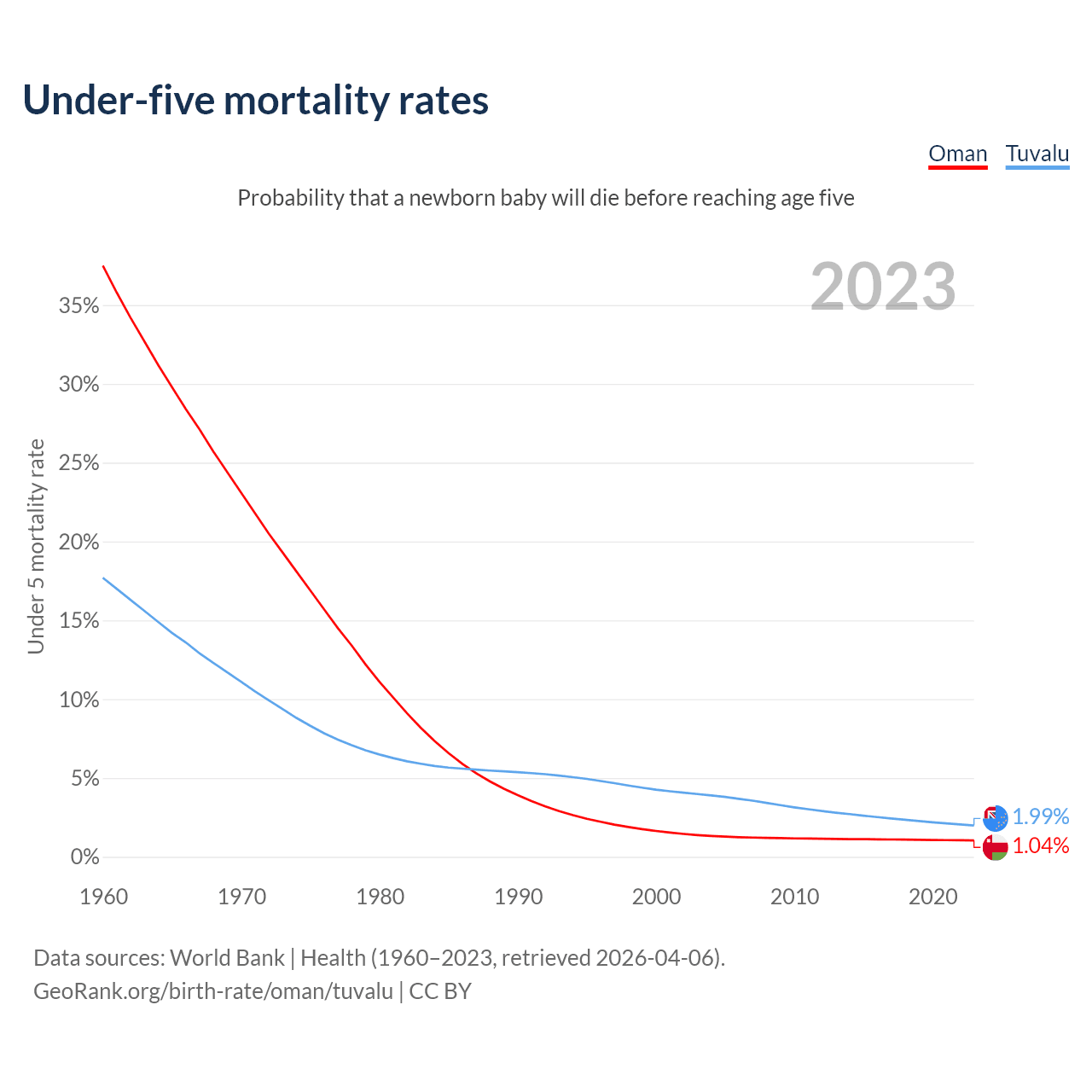 The chance that a newborn baby will die before reaching age five is 1.04% in Oman and 1.99% in Tuvalu. Above is a chart with historical data on under-five mortality rates.