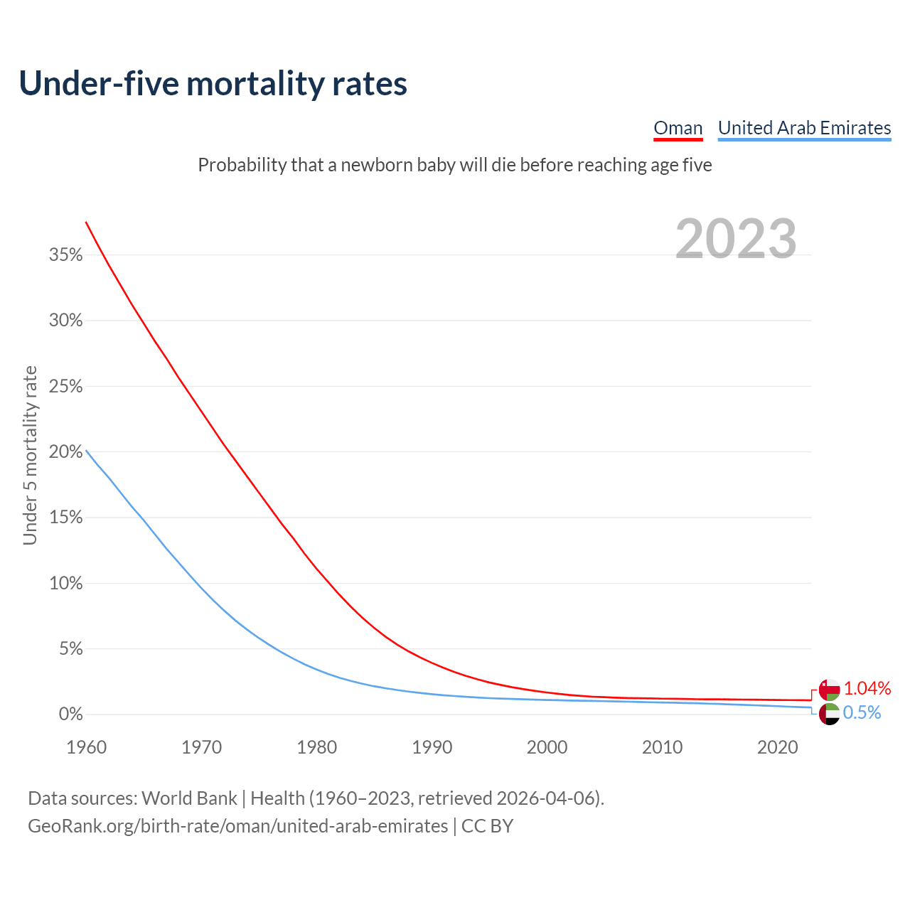 The chance that a newborn baby will die before reaching age five is 1.04% in Oman and 0.5% in the United Arab Emirates. Above is a chart with historical data on under-five mortality rates.
