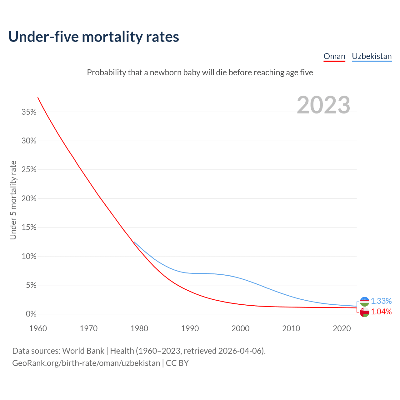 The chance that a newborn baby will die before reaching age five is 1.04% in Oman and 1.33% in Uzbekistan. Above is a chart with historical data on under-five mortality rates.