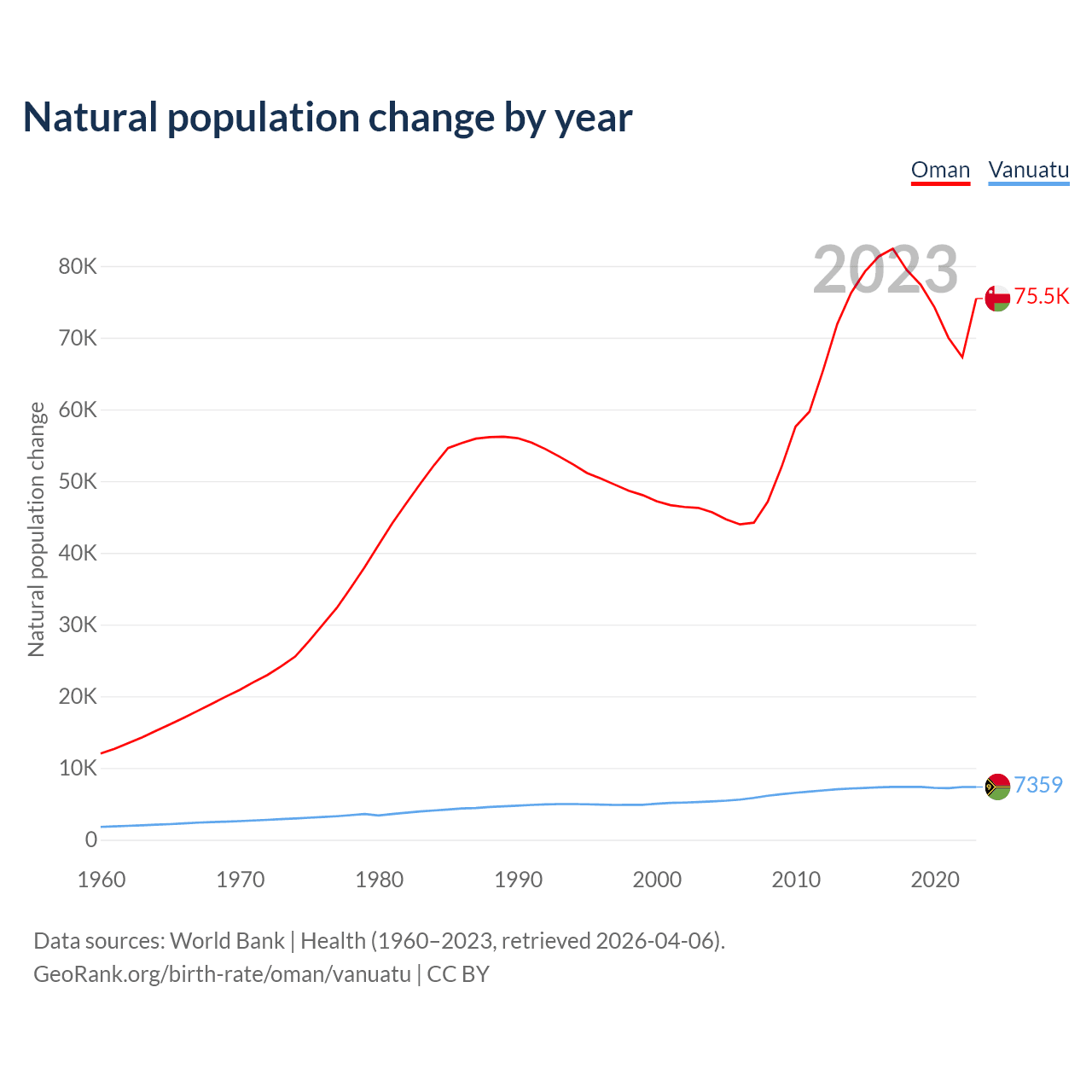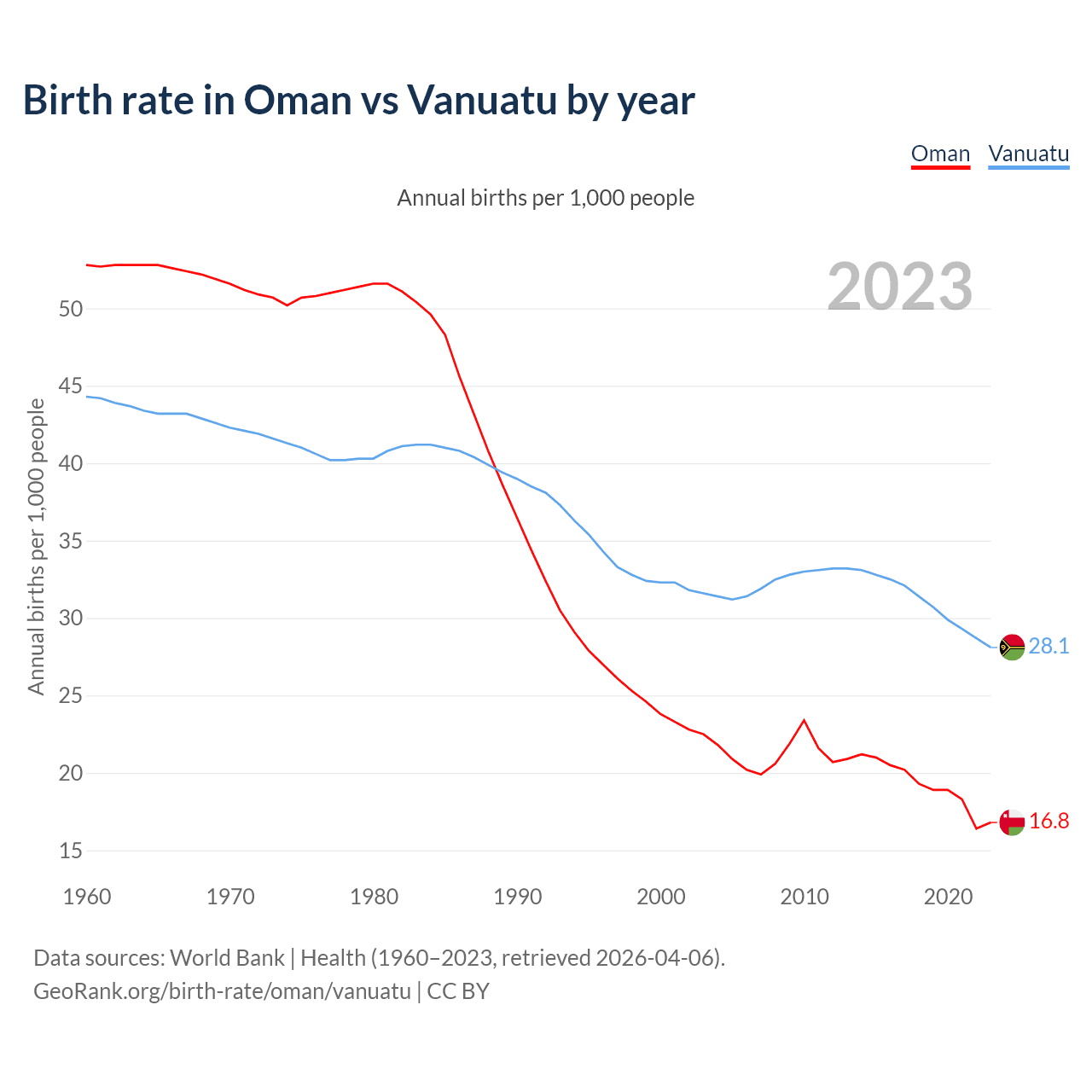 Oman has an annual birth rate of 16.8 births per 1,000 people, compared to 28.1 for Vanuatu. The average number of children a woman is expected to have during her lifetime — the fertility rate, is 2.53 in Oman and 3.6 in Vanuatu — 42.4% difference.