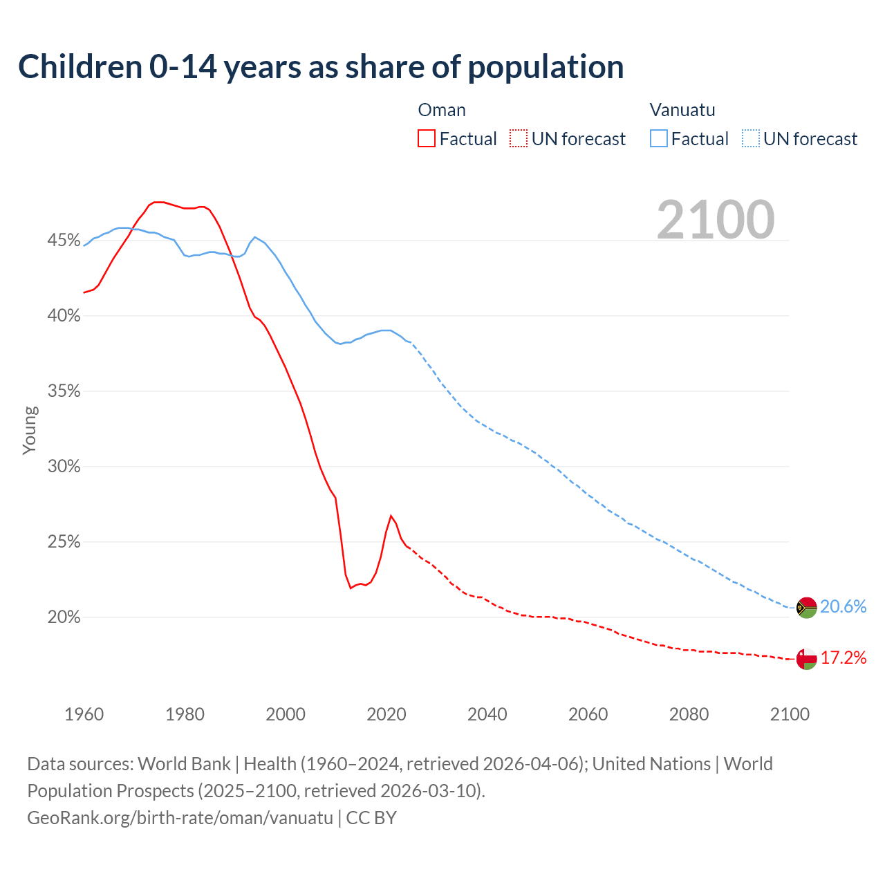 According to the latest available data on birth rates, the fertility rate in Oman was 2.53 children per woman in 2023, compared to 3.6 in Vanuatu in 2023. The replacement level is considered to be 2.1 children per woman.