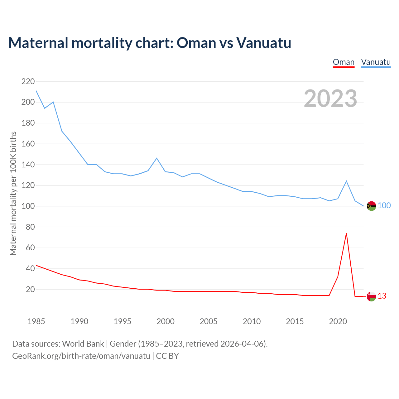 The maternal mortality rate, which is the probability of dying during childbirth or within 42 days of pregnancy termination, is 13 deaths per 100,000 live births in Oman, compared to 100 deaths in Vanuatu.