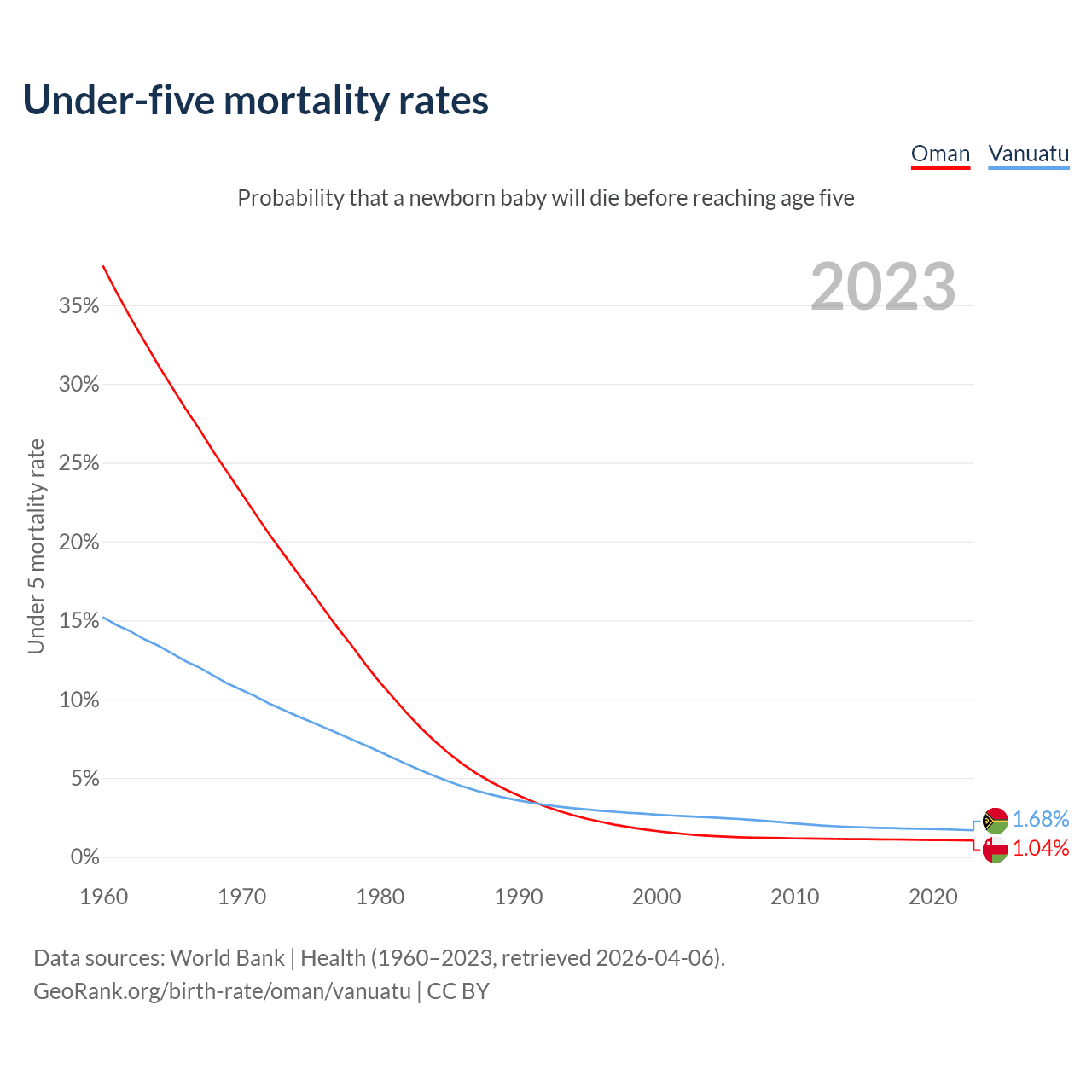 The chance that a newborn baby will die before reaching age five is 1.04% in Oman and 1.68% in Vanuatu. Above is a chart with historical data on under-five mortality rates.