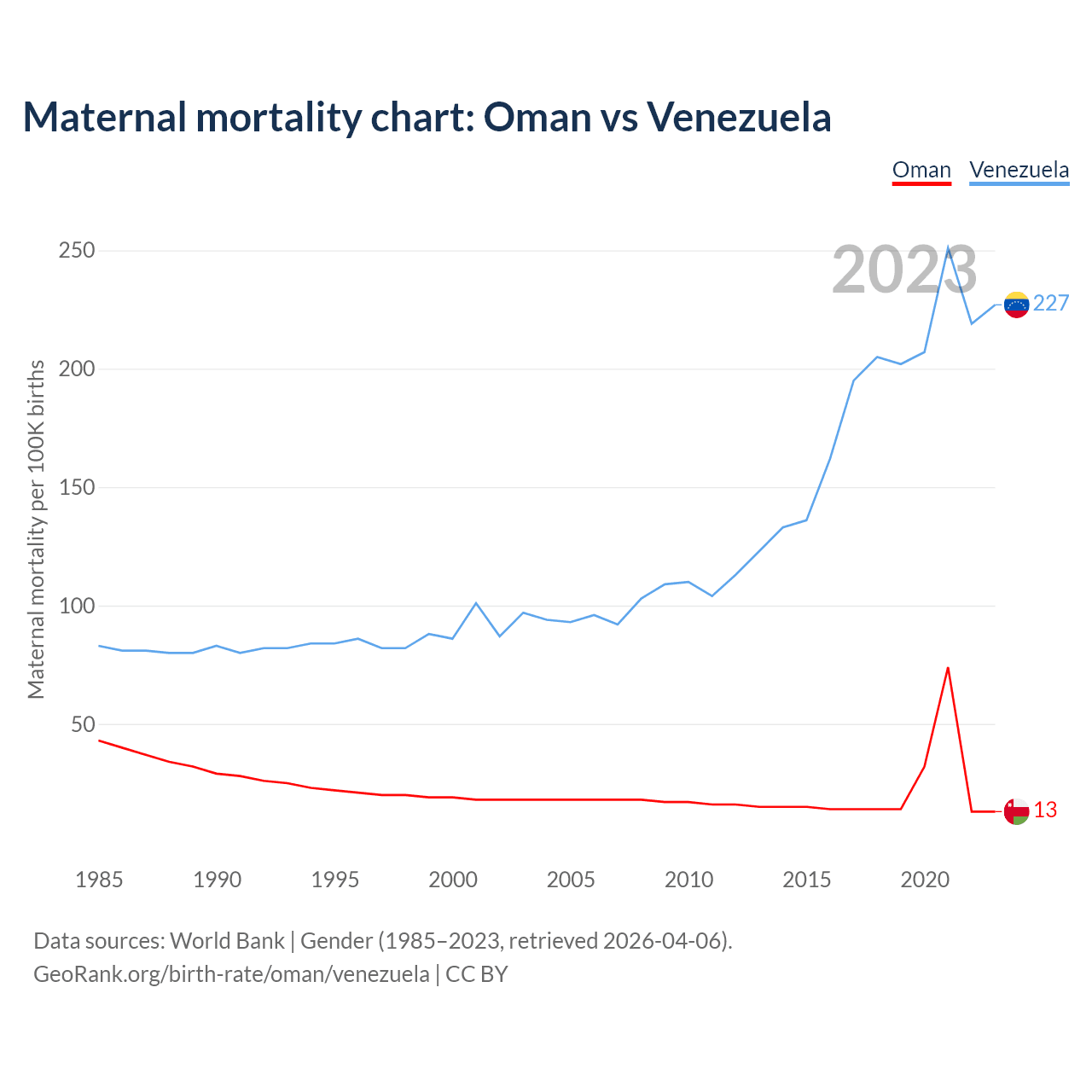 The maternal mortality rate, which is the probability of dying during childbirth or within 42 days of pregnancy termination, is 13 deaths per 100,000 live births in Oman, compared to 227 deaths in Venezuela.