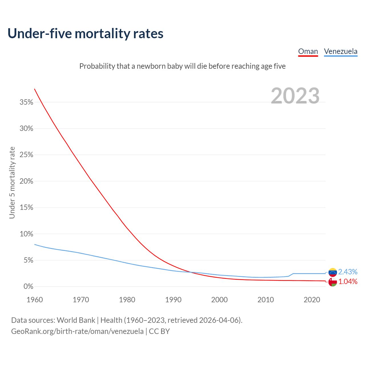 The chance that a newborn baby will die before reaching age five is 1.04% in Oman and 2.43% in Venezuela. Above is a chart with historical data on under-five mortality rates.