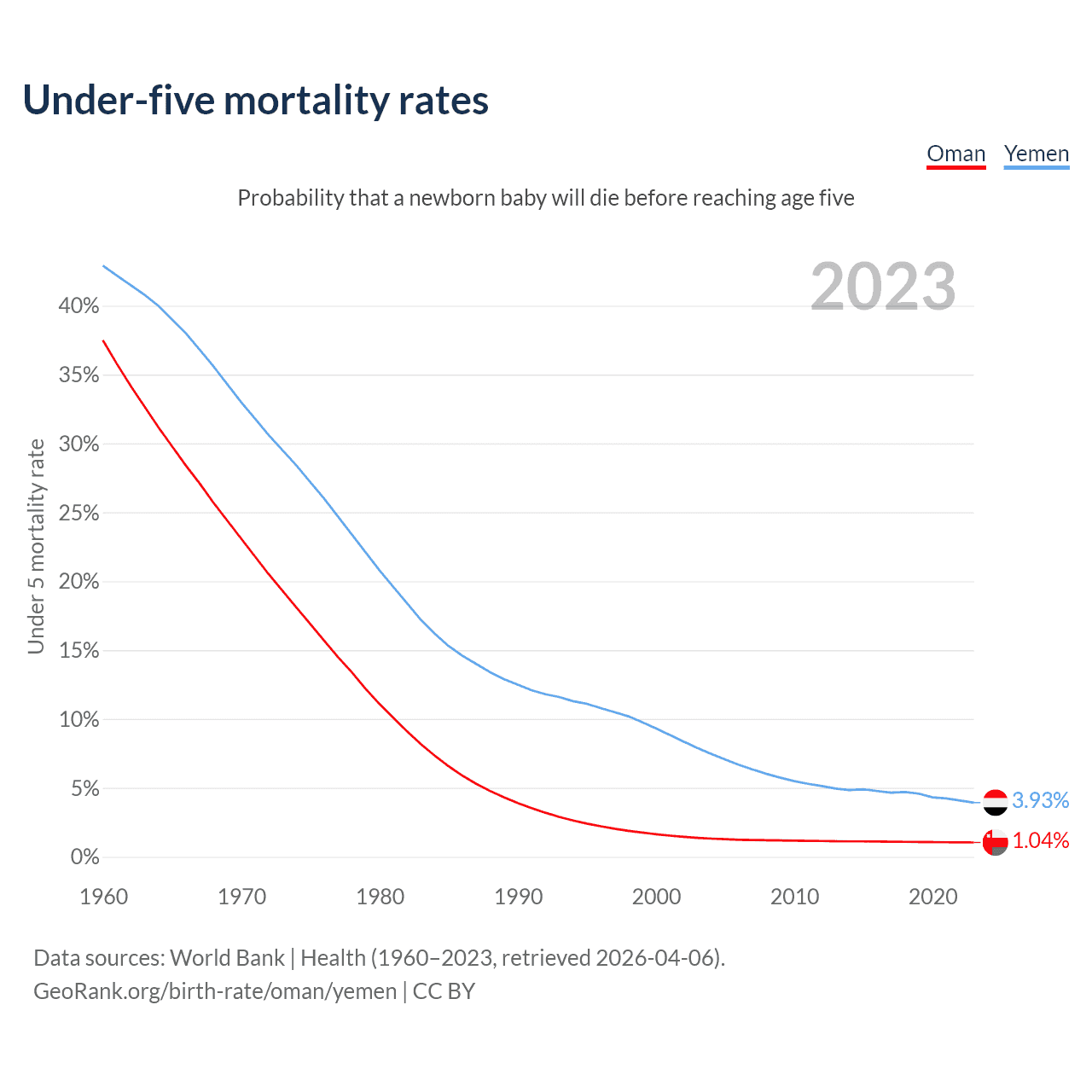 The chance that a newborn baby will die before reaching age five is 1.04% in Oman and 3.93% in Yemen. Above is a chart with historical data on under-five mortality rates.