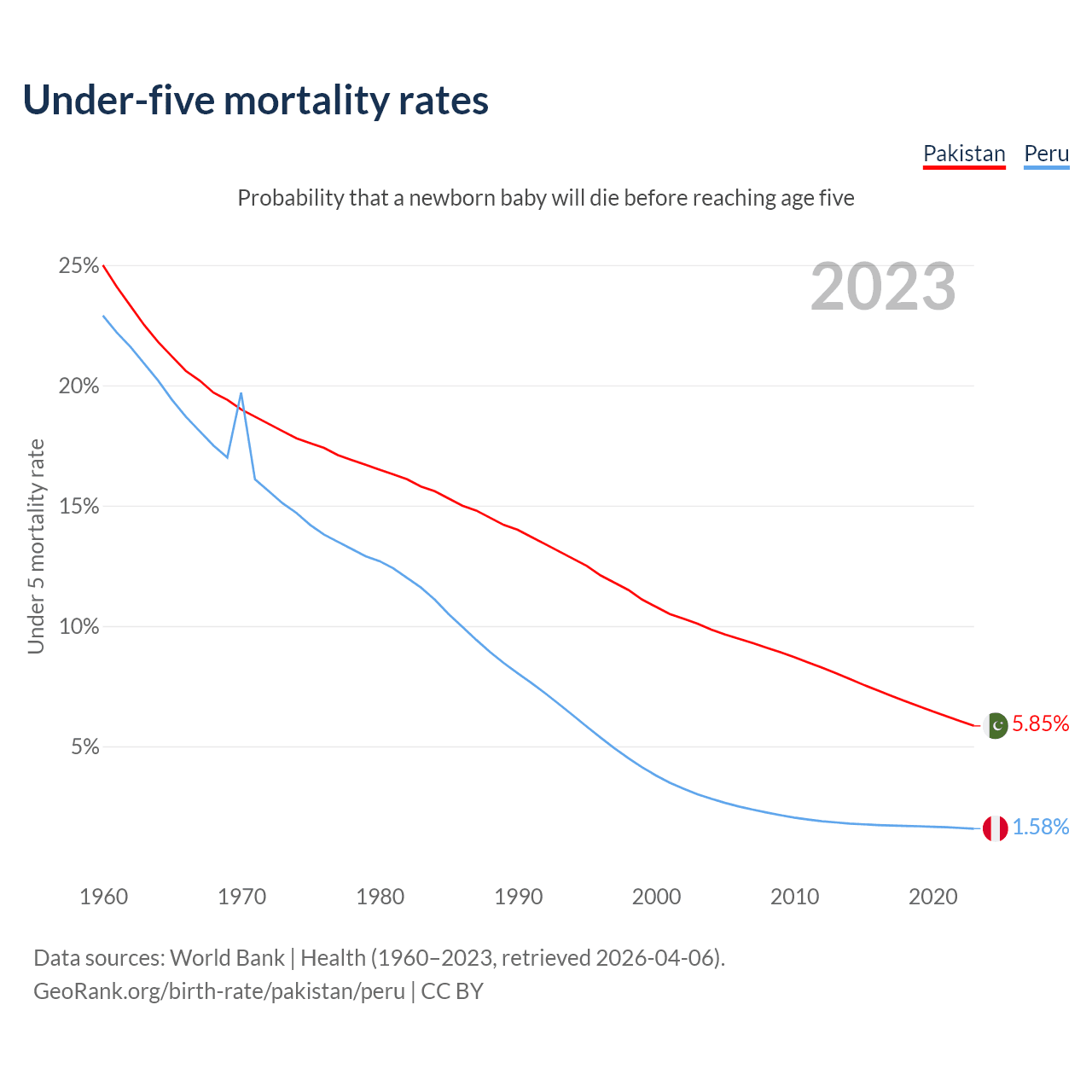 The chance that a newborn baby will die before reaching age five is 5.85% in Pakistan and 1.58% in Peru. Above is a chart with historical data on under-five mortality rates.