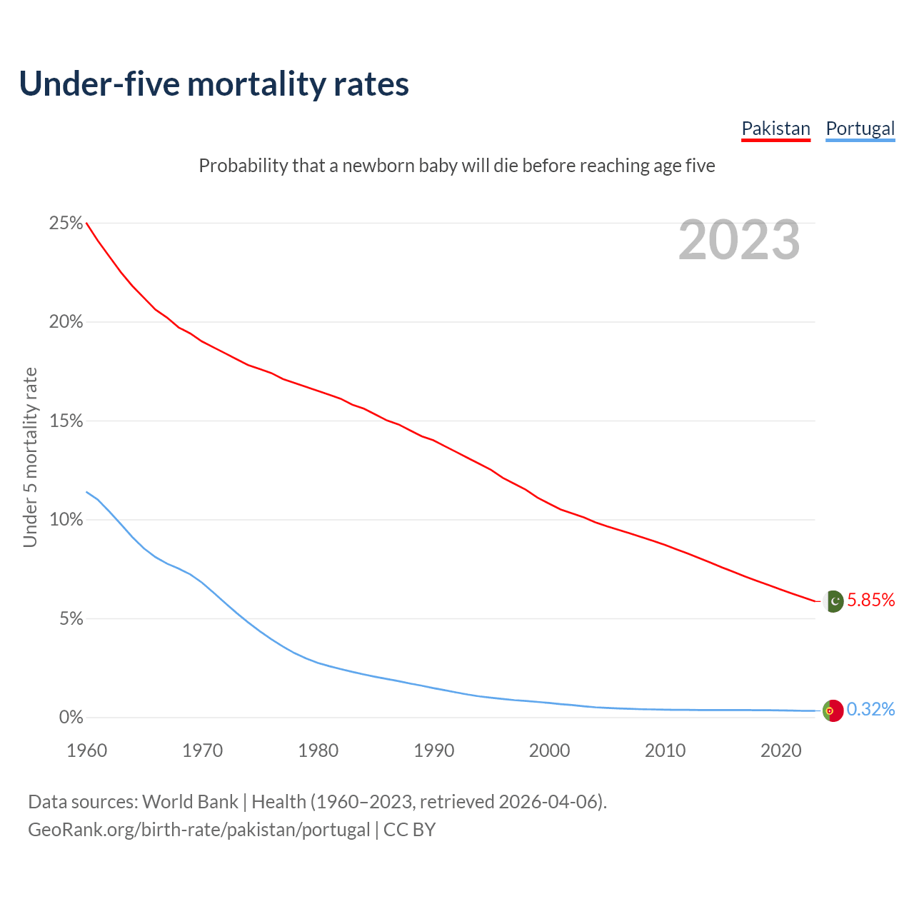 The chance that a newborn baby will die before reaching age five is 5.85% in Pakistan and 0.32% in Portugal. Above is a chart with historical data on under-five mortality rates.