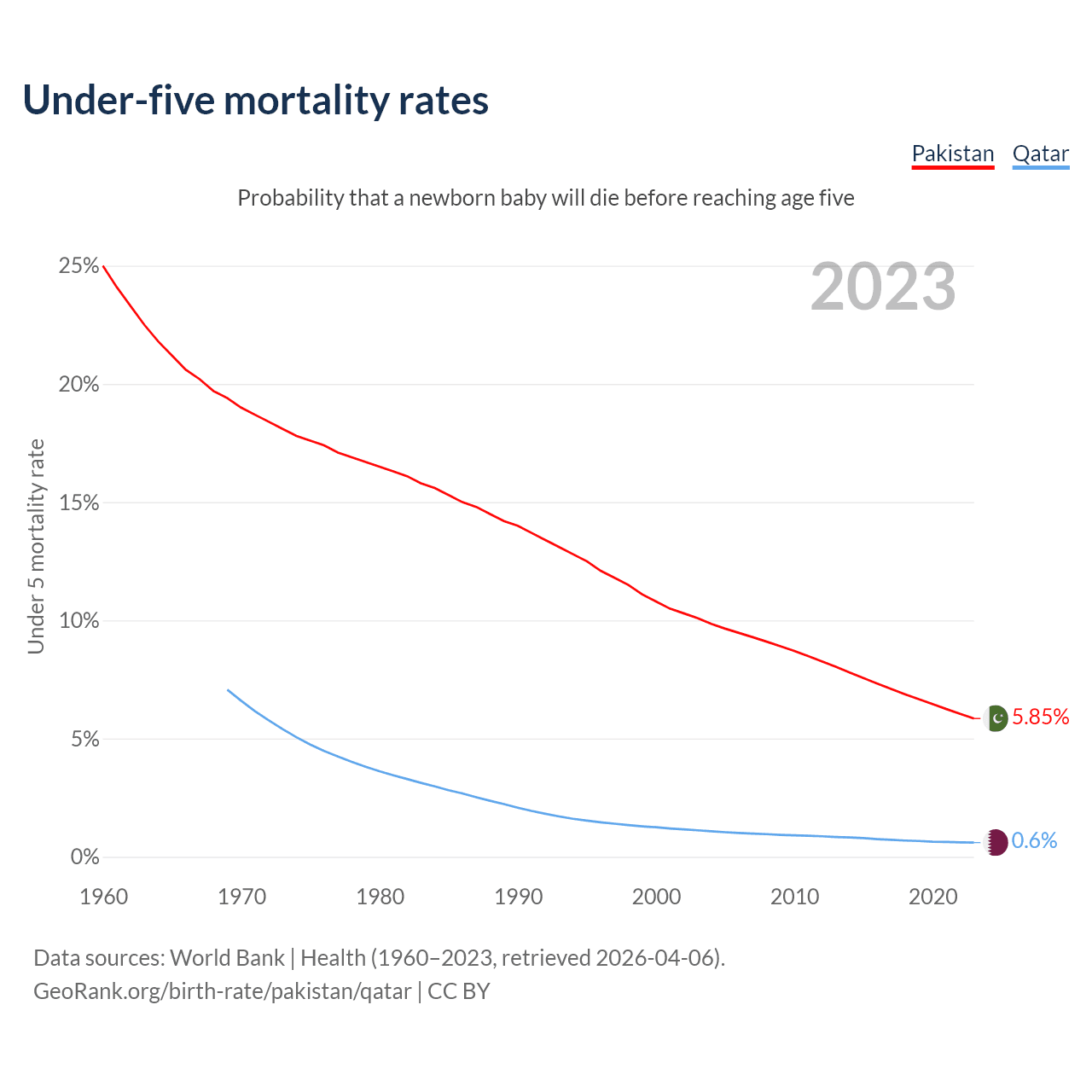 The chance that a newborn baby will die before reaching age five is 5.85% in Pakistan and 0.6% in Qatar. Above is a chart with historical data on under-five mortality rates.