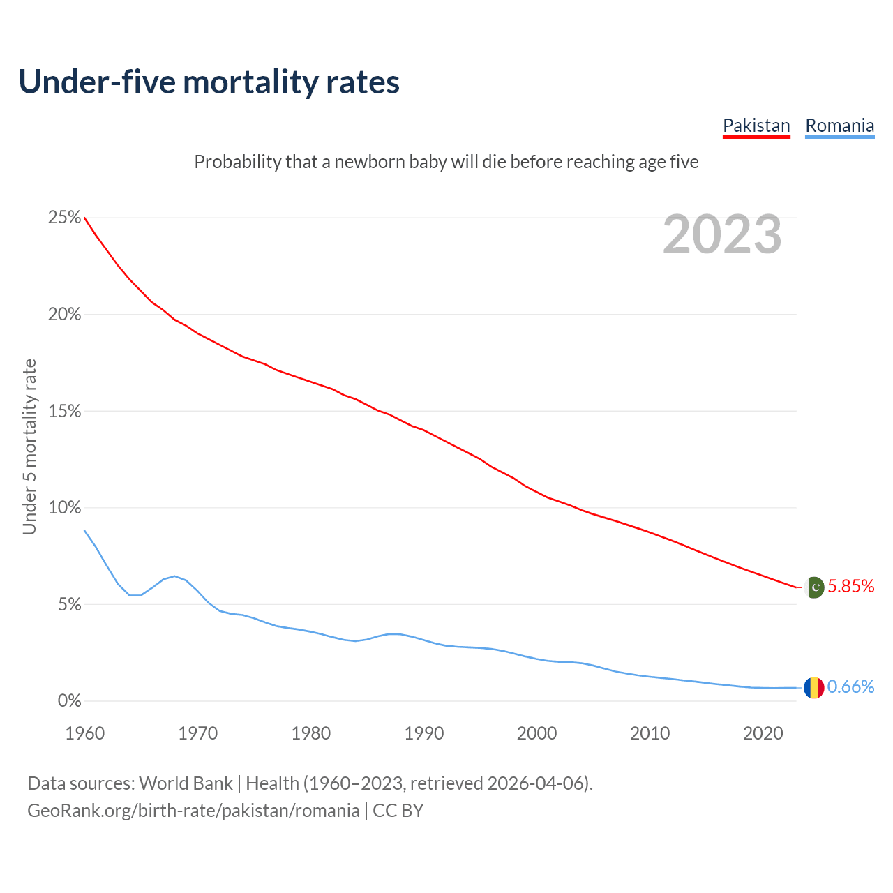 The chance that a newborn baby will die before reaching age five is 5.85% in Pakistan and 0.66% in Romania. Above is a chart with historical data on under-five mortality rates.
