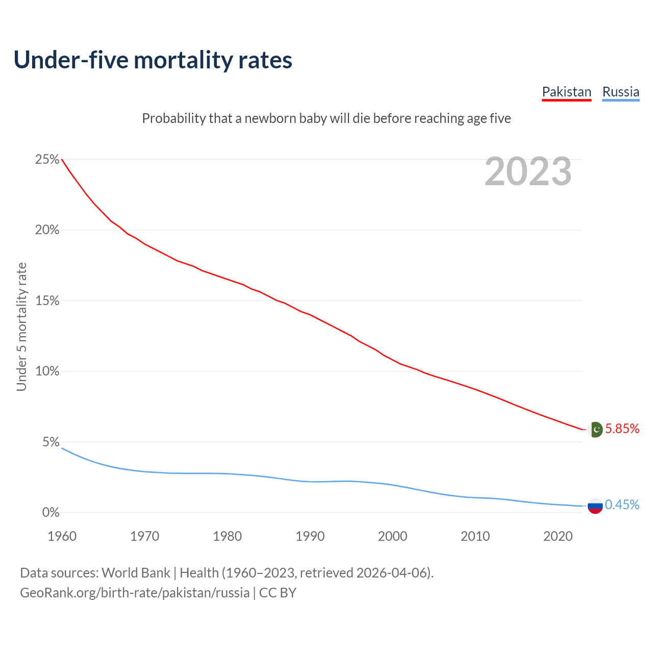 The chance that a newborn baby will die before reaching age five is 5.85% in Pakistan and 0.45% in Russia. Above is a chart with historical data on under-five mortality rates.