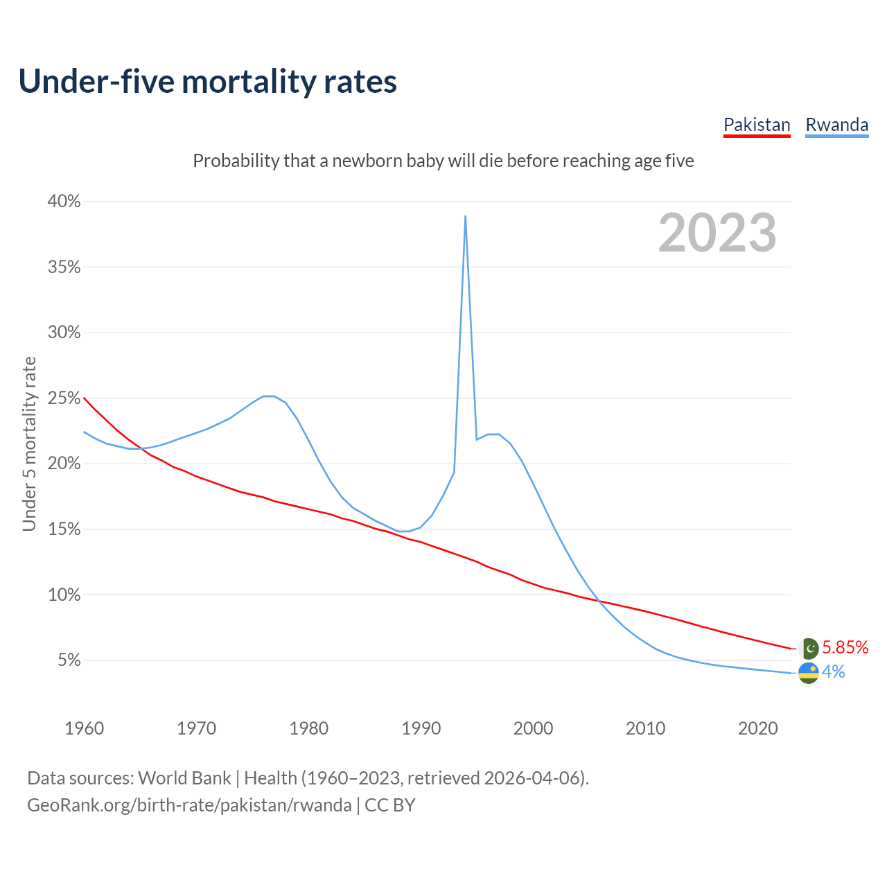 The chance that a newborn baby will die before reaching age five is 5.85% in Pakistan and 4% in Rwanda. Above is a chart with historical data on under-five mortality rates.