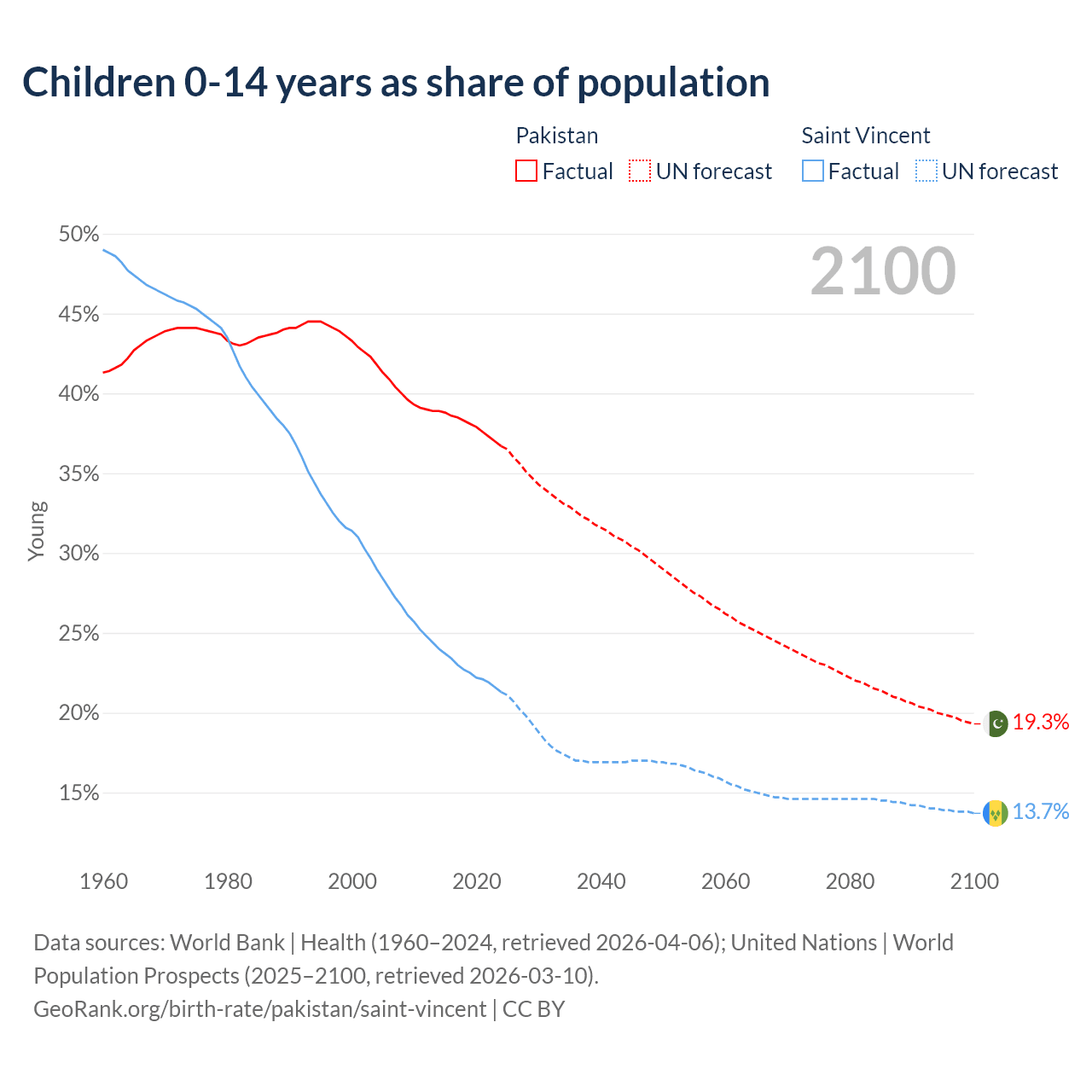 According to the latest available data on birth rates, the fertility rate in Pakistan was 3.61 children per woman in 2023, compared to 1.78 in Saint Vincent in 2023. The replacement level is considered to be 2.1 children per woman.