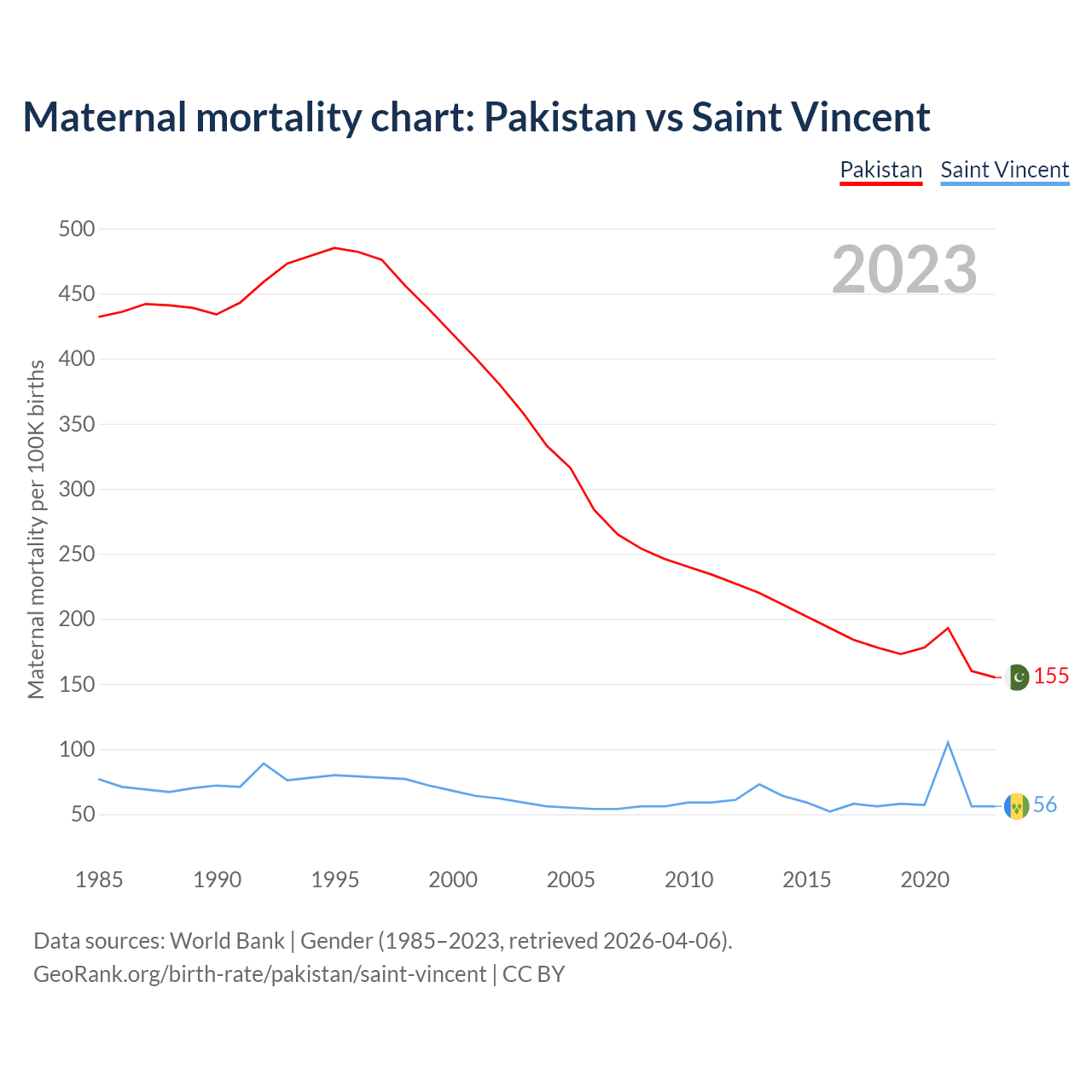 The maternal mortality rate, which is the probability of dying during childbirth or within 42 days of pregnancy termination, is 155 deaths per 100,000 live births in Pakistan, compared to 56 deaths in Saint Vincent.