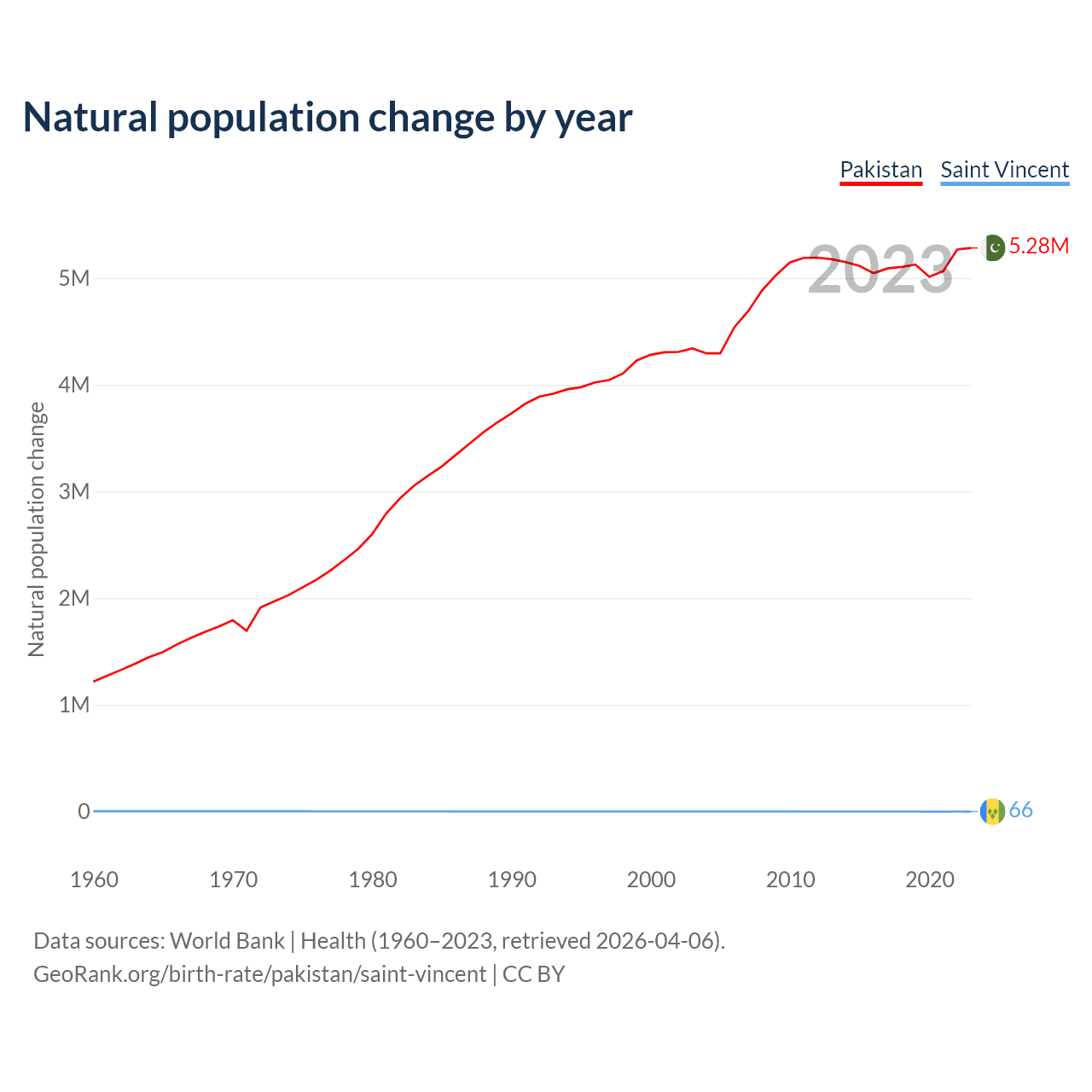 Pakistan has an annual birth rate of 27.8 births per 1,000 people, compared to 12.2 for Saint Vincent. The average number of children a woman is expected to have during her lifetime — the fertility rate, is 3.61 in Pakistan and 1.78 in Saint Vincent — 50.8% difference.