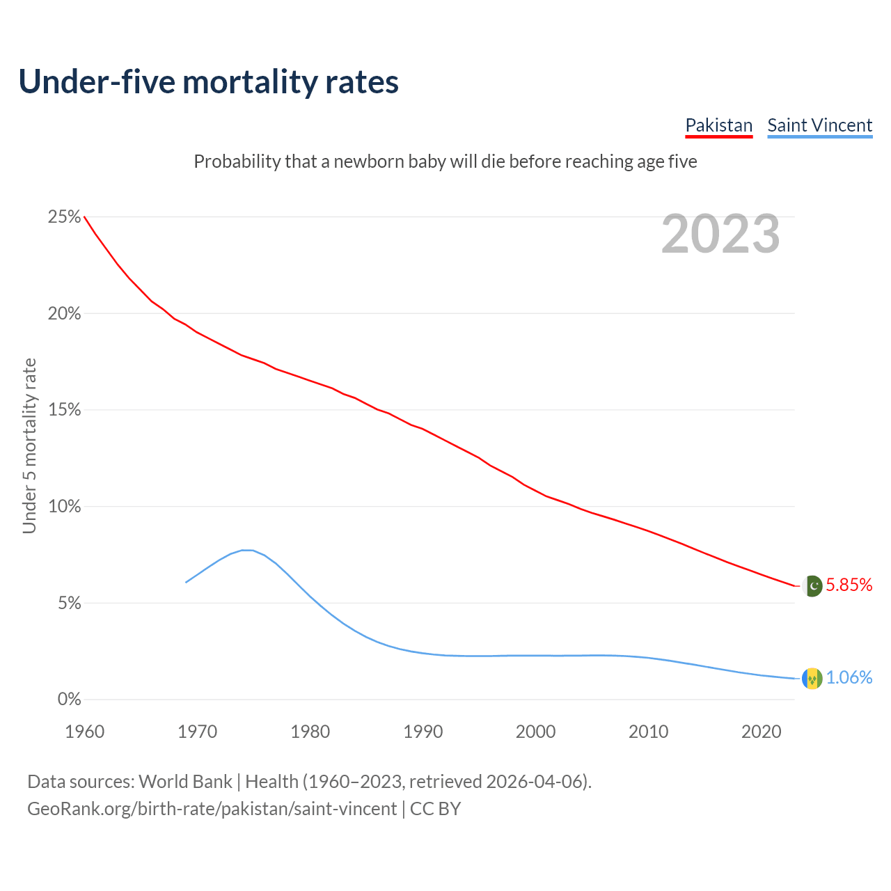 The chance that a newborn baby will die before reaching age five is 5.85% in Pakistan and 1.06% in Saint Vincent. Above is a chart with historical data on under-five mortality rates.