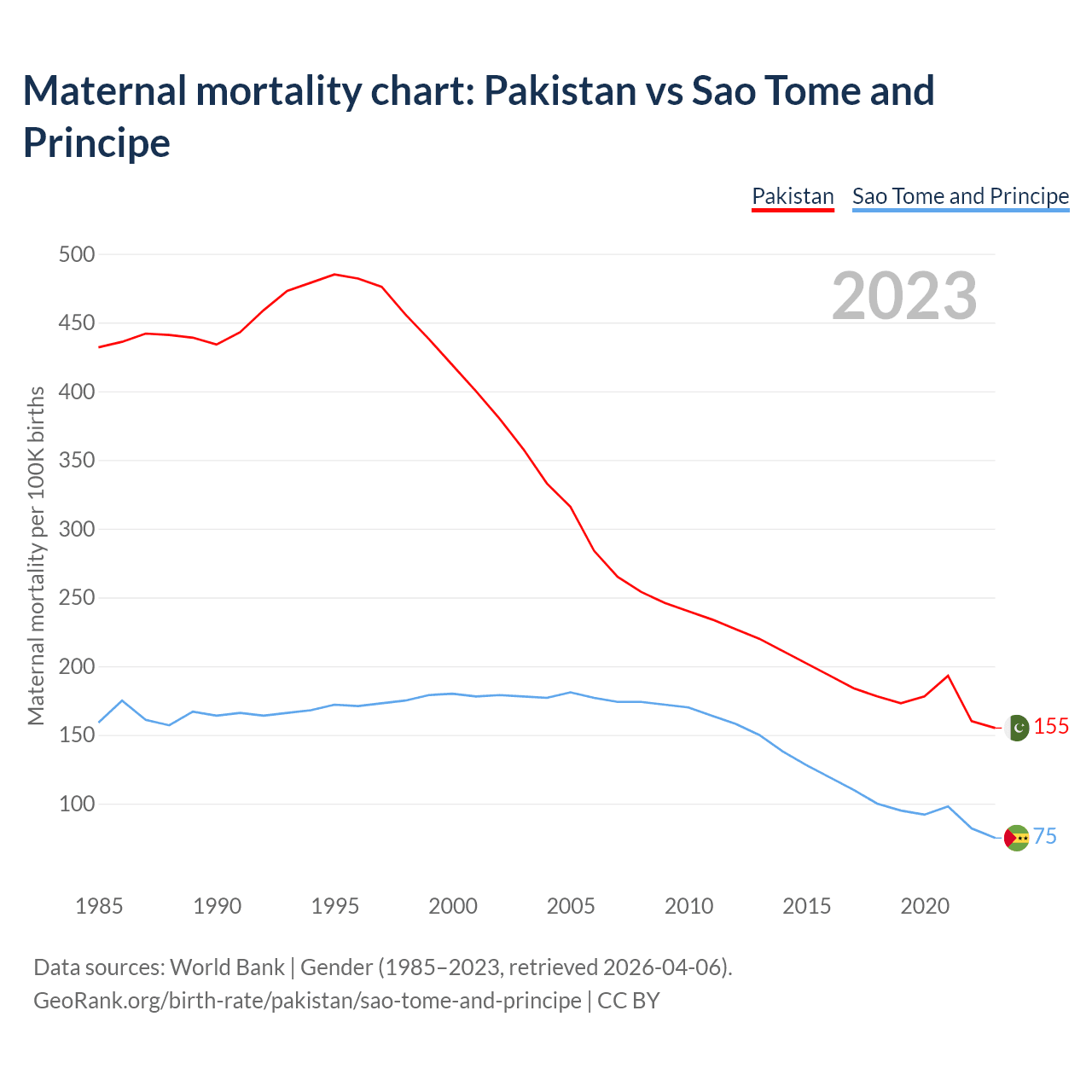 The maternal mortality rate, which is the probability of dying during childbirth or within 42 days of pregnancy termination, is 155 deaths per 100,000 live births in Pakistan, compared to 75 deaths in Sao Tome and Principe.