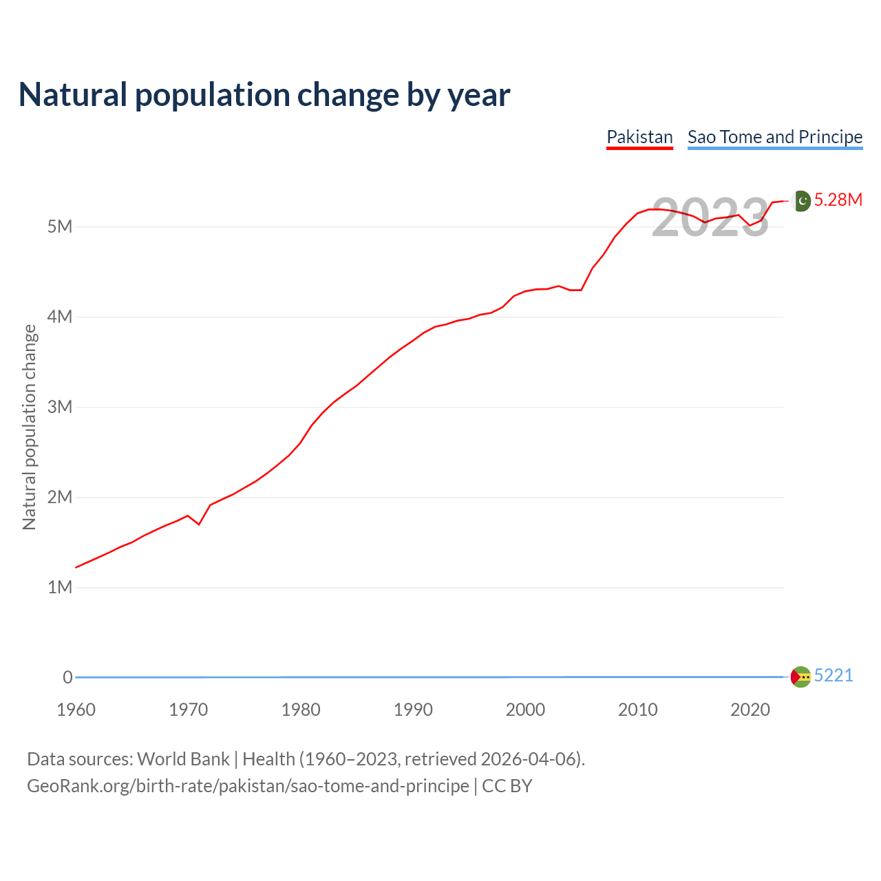 Pakistan has an annual birth rate of 27.8 births per 1,000 people, compared to 28.2 for Sao Tome and Principe. The average number of children a woman is expected to have during her lifetime — the fertility rate, is 3.61 in Pakistan and 3.64 in Sao Tome and Principe — 1.08% difference.