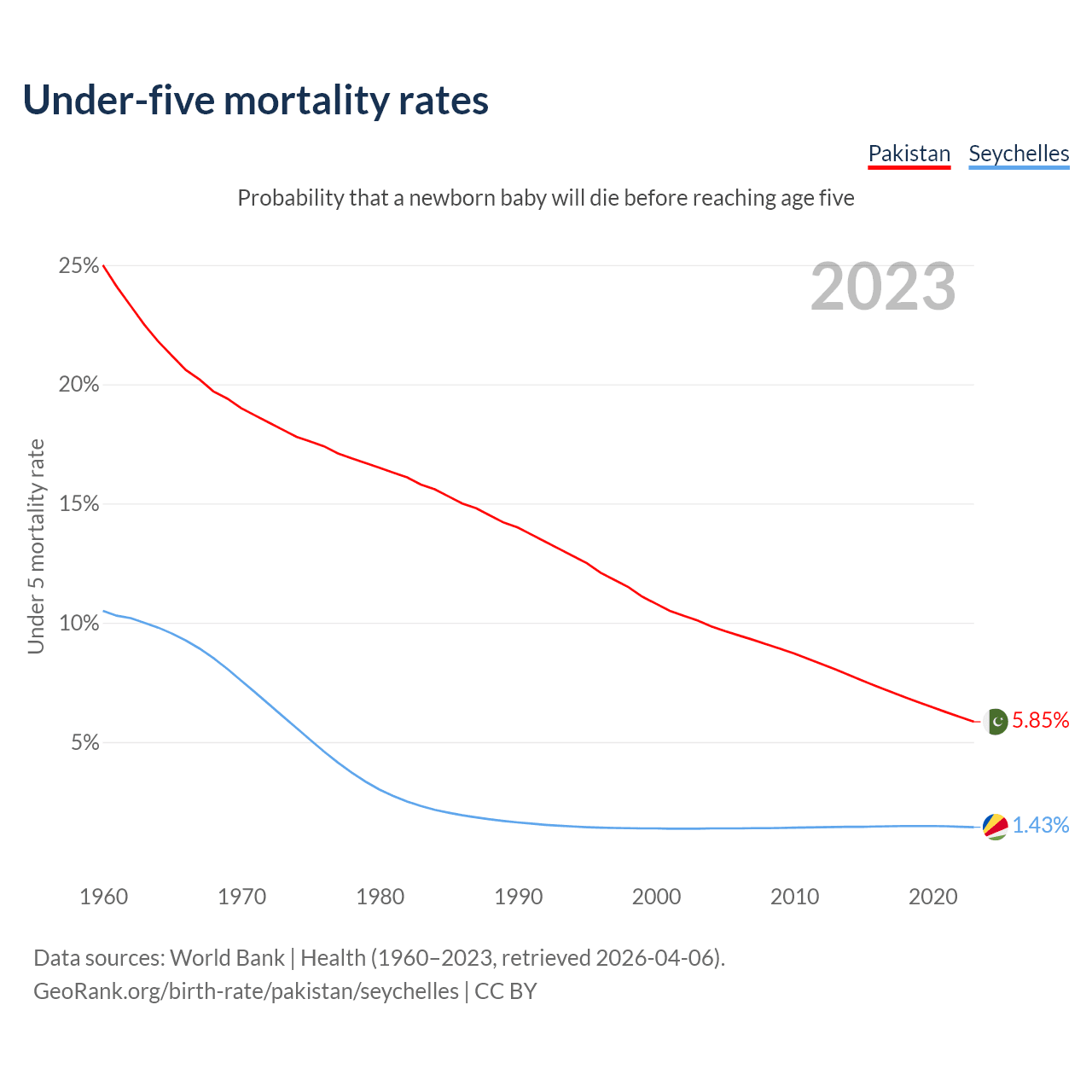 The chance that a newborn baby will die before reaching age five is 5.85% in Pakistan and 1.43% in the Seychelles. Above is a chart with historical data on under-five mortality rates.