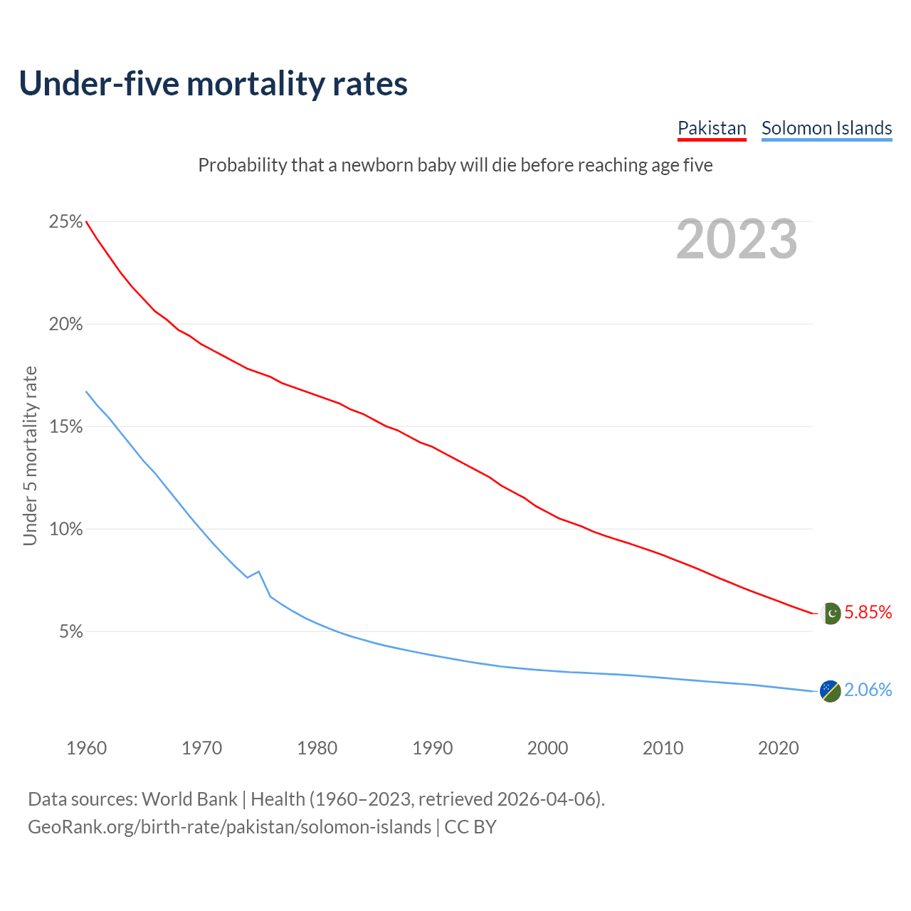 The chance that a newborn baby will die before reaching age five is 5.85% in Pakistan and 2.06% in the Solomon Islands. Above is a chart with historical data on under-five mortality rates.