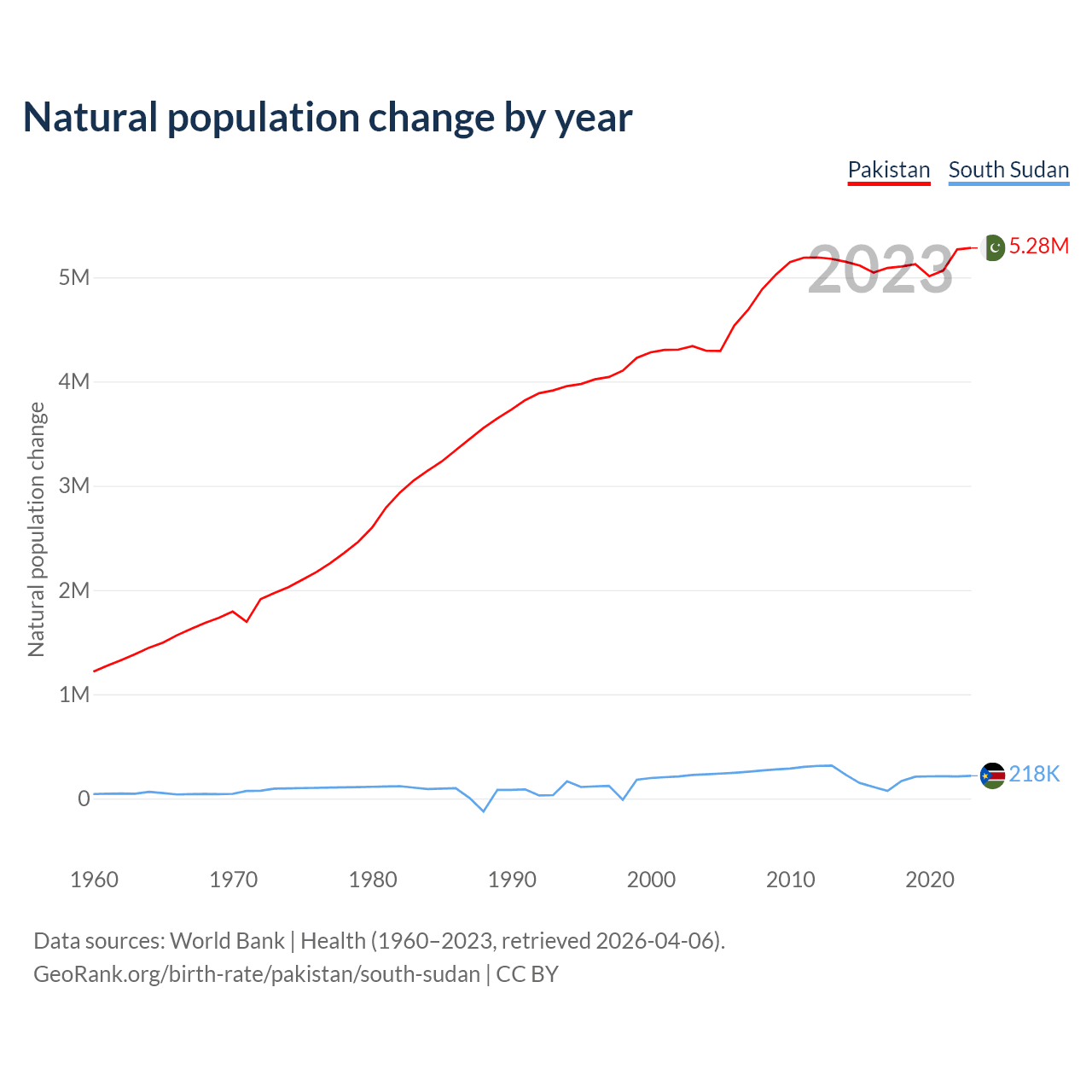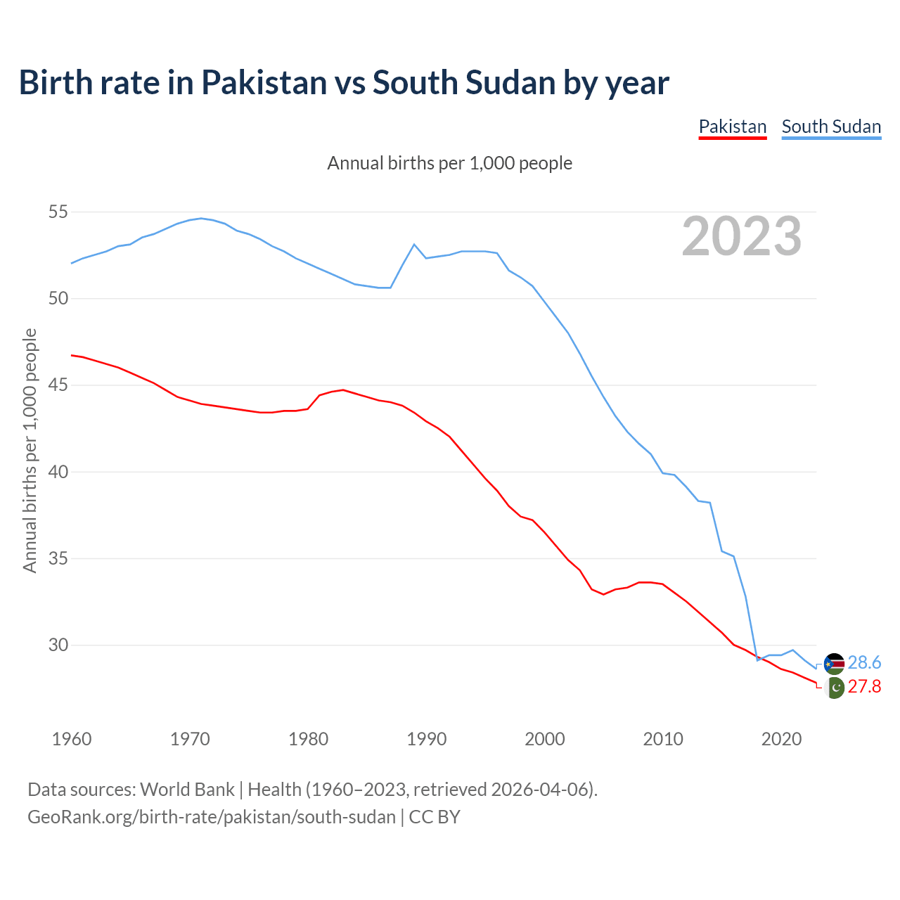 Pakistan has an annual birth rate of 27.8 births per 1,000 people, compared to 28.6 for South Sudan. The average number of children a woman is expected to have during her lifetime — the fertility rate, is 3.61 in Pakistan and 3.86 in South Sudan — 7.18% difference.