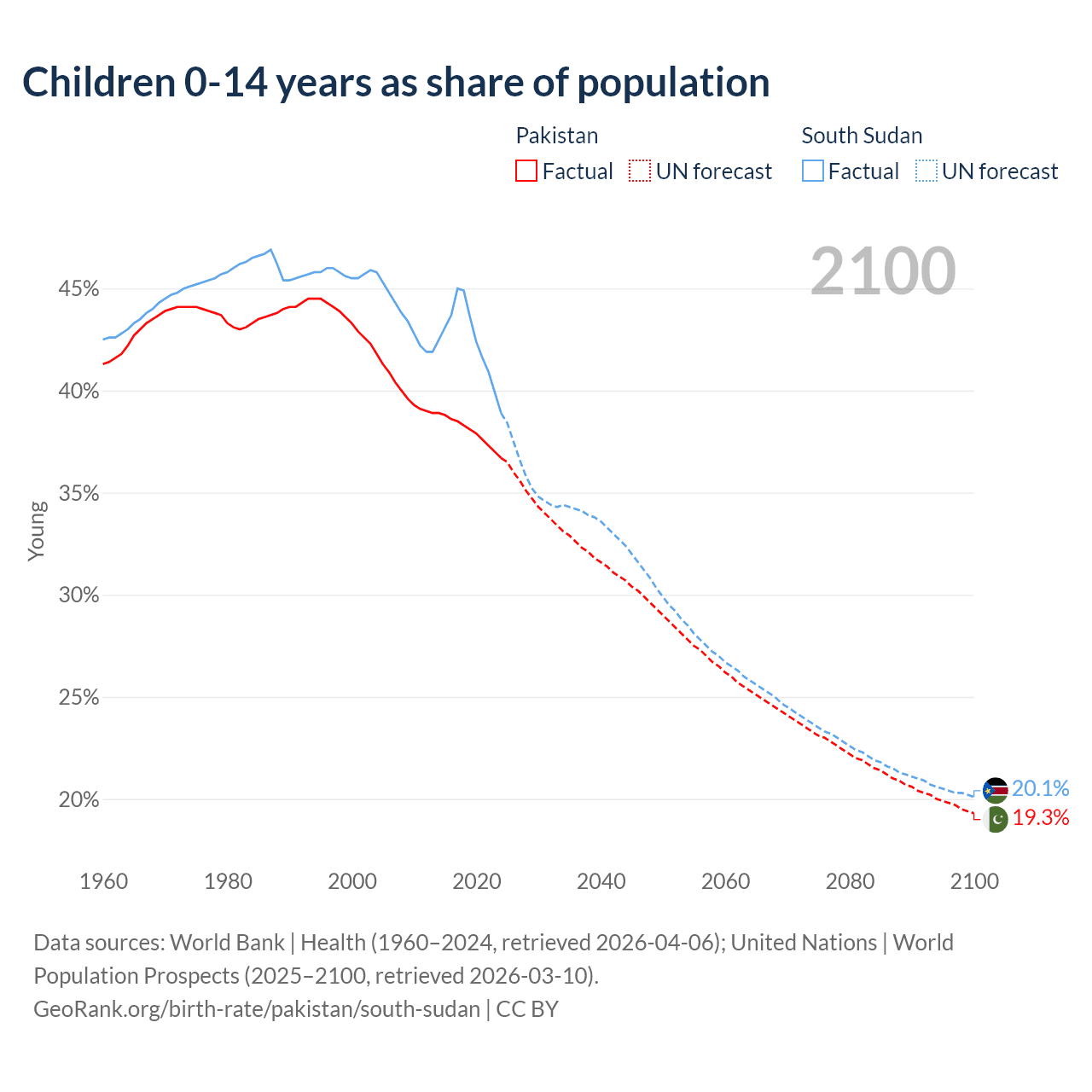 According to the latest available data on birth rates, the fertility rate in Pakistan was 3.61 children per woman in 2023, compared to 3.86 in South Sudan in 2023. The replacement level is considered to be 2.1 children per woman.