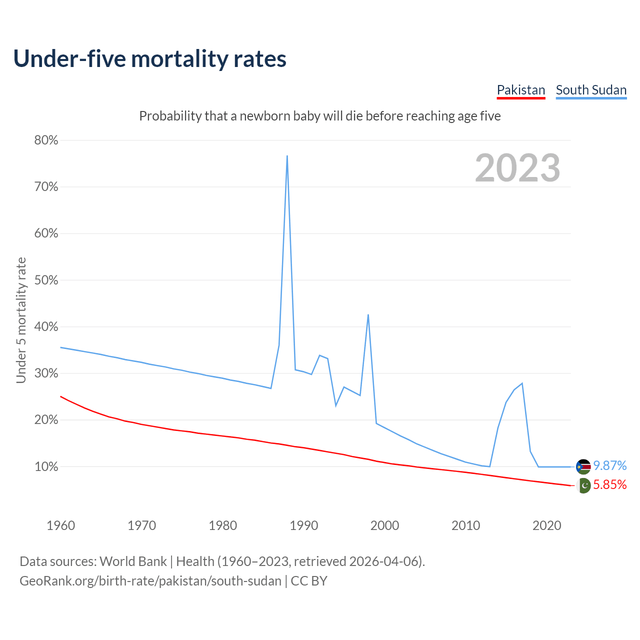 The chance that a newborn baby will die before reaching age five is 5.85% in Pakistan and 9.87% in South Sudan. Above is a chart with historical data on under-five mortality rates.