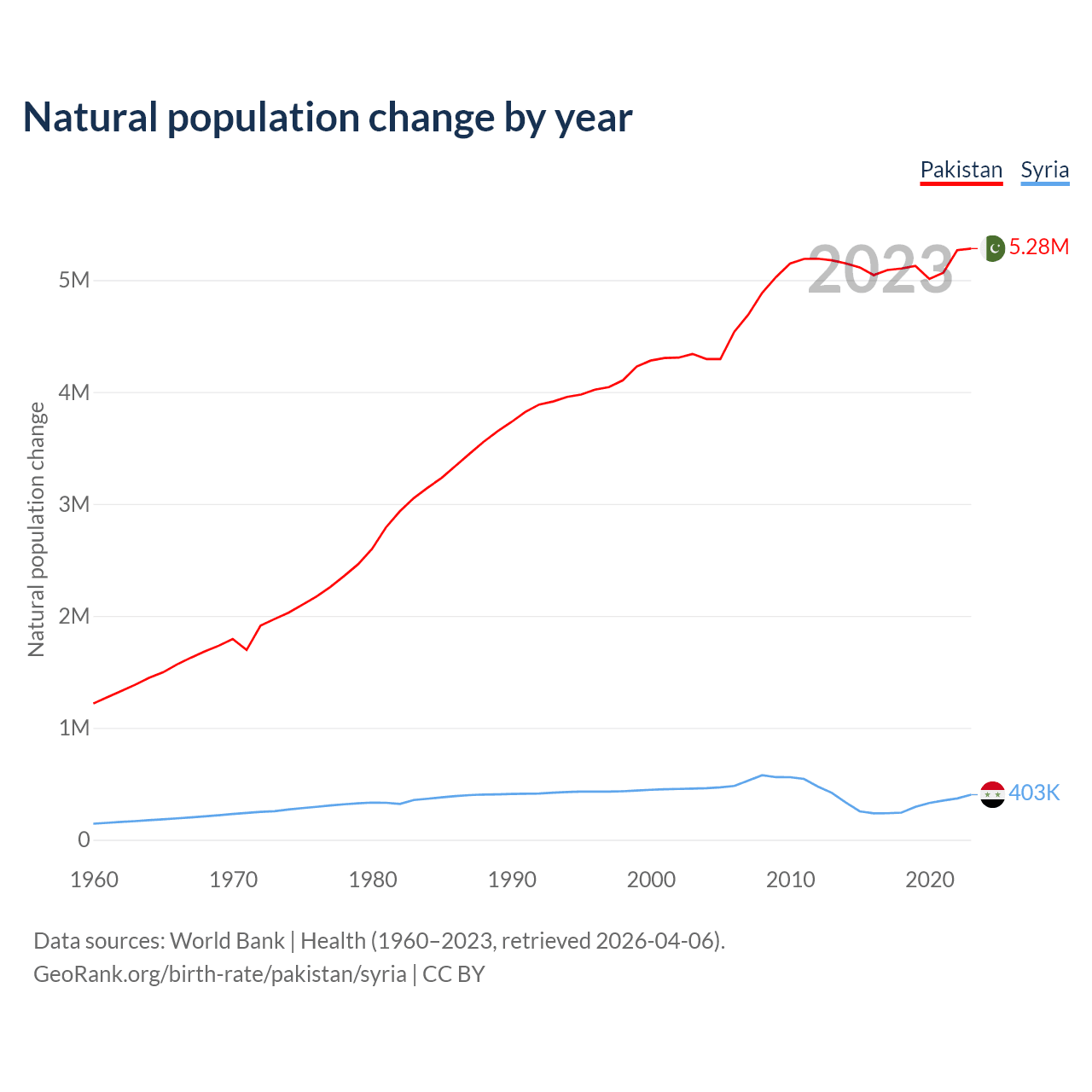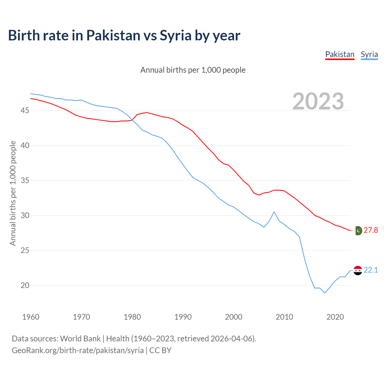 Pakistan has an annual birth rate of 27.8 births per 1,000 people, compared to 22.1 for Syria. The average number of children a woman is expected to have during her lifetime — the fertility rate, is 3.61 in Pakistan and 2.71 in Syria — 24.8% difference.