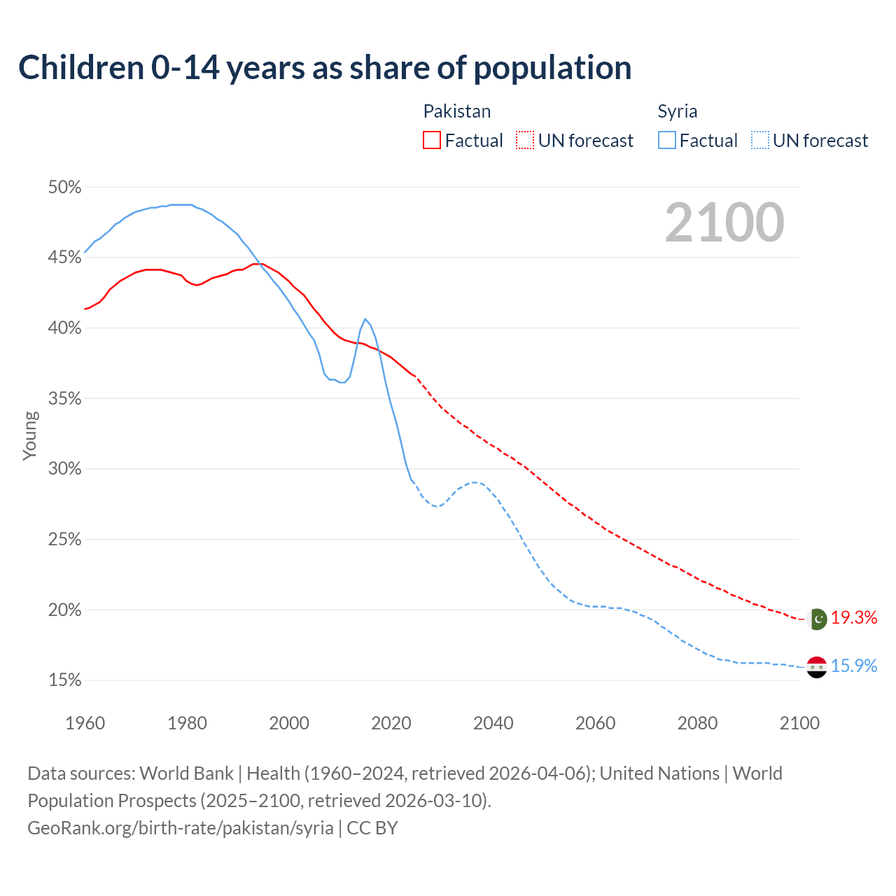 According to the latest available data on birth rates, the fertility rate in Pakistan was 3.61 children per woman in 2023, compared to 2.71 in Syria in 2023. The replacement level is considered to be 2.1 children per woman.